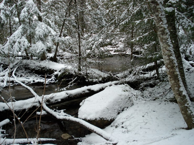 And the snow! Walking through mostly untouched, clean white snow, with a river flowing quickly by on one side, surrounded by trees…that’s kind of heaven. Also, has anybody seen the old BBC version of The Lion, The Witch, and the Wardrobe? Do you remember the scene where spring is just starting to win out over the long winter and the children stop and listen to the newly unfrozen creek? This kind of reminded me of that.