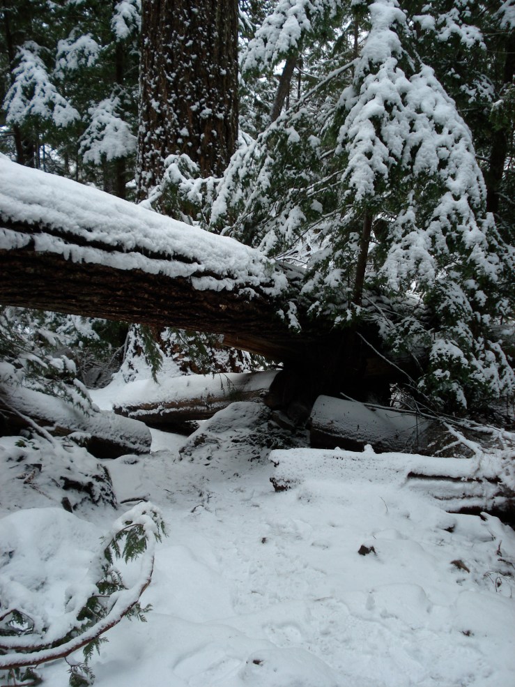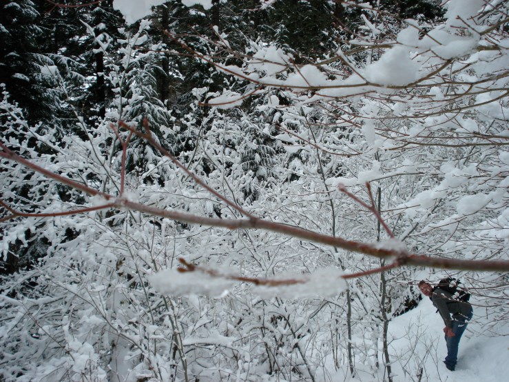 The way back down ended up being the more challenging, due to the snow. I did mostly okay since my boots had good hiking boots but Peter’s hiking boots didn’t do him many favours. We were both grabbing at tree branches and moving sideways most of the way. The craziest moment though was when Peter lost his footing and slipped a few feet. He put out his hands to stop his slide and then got back up. He wasn’t wearing gloves and his bare hands were in the snow. I was coming up behind him, still at the top of where he began to slip. After checking that he was okay, I started to make my own way down. I had my eyes on the ground, watching my footing carefully, when something shiny caught my eye. My first thought was that it was a bottle cap but something made me take a second look and I suddenly recognized it as my husband’s wedding ring! With his cold hands, Peter hadn’t noticed it was missing and if I hadn’t been behind him and spotted it, the ring would probably still be in the woods right now. Thank goodness I’m attracted to shiny objects!