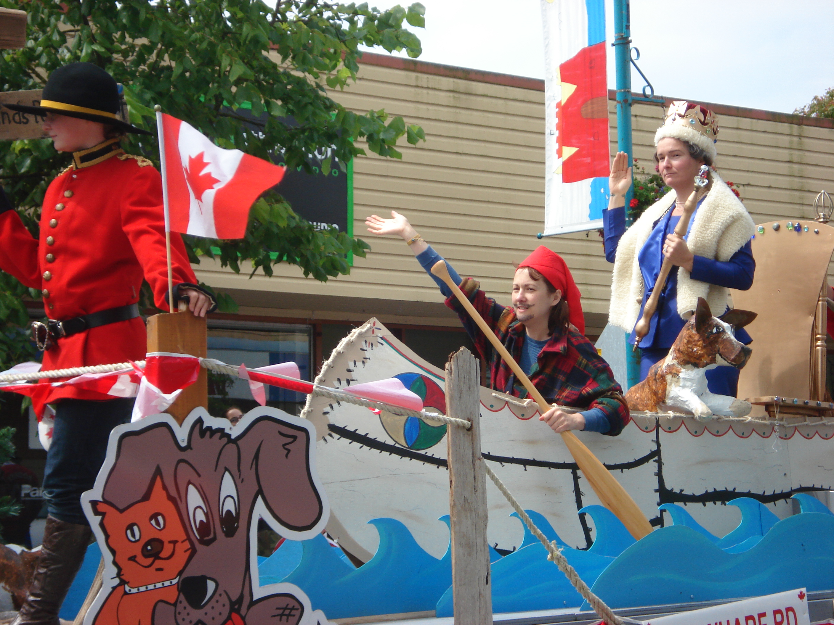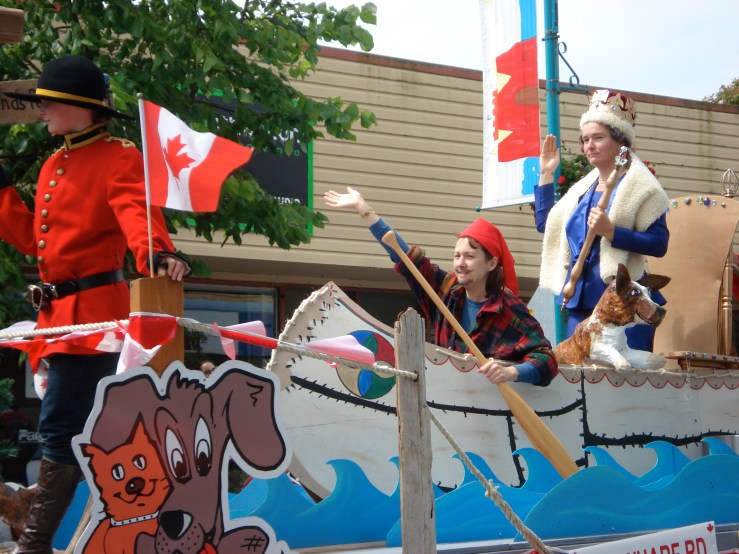 There were a few references to the queen this year, due to her recent anniversary, no doubt. Here she is with a Mountie and a couer-du-bois and a dog (this was the pet store’s float).