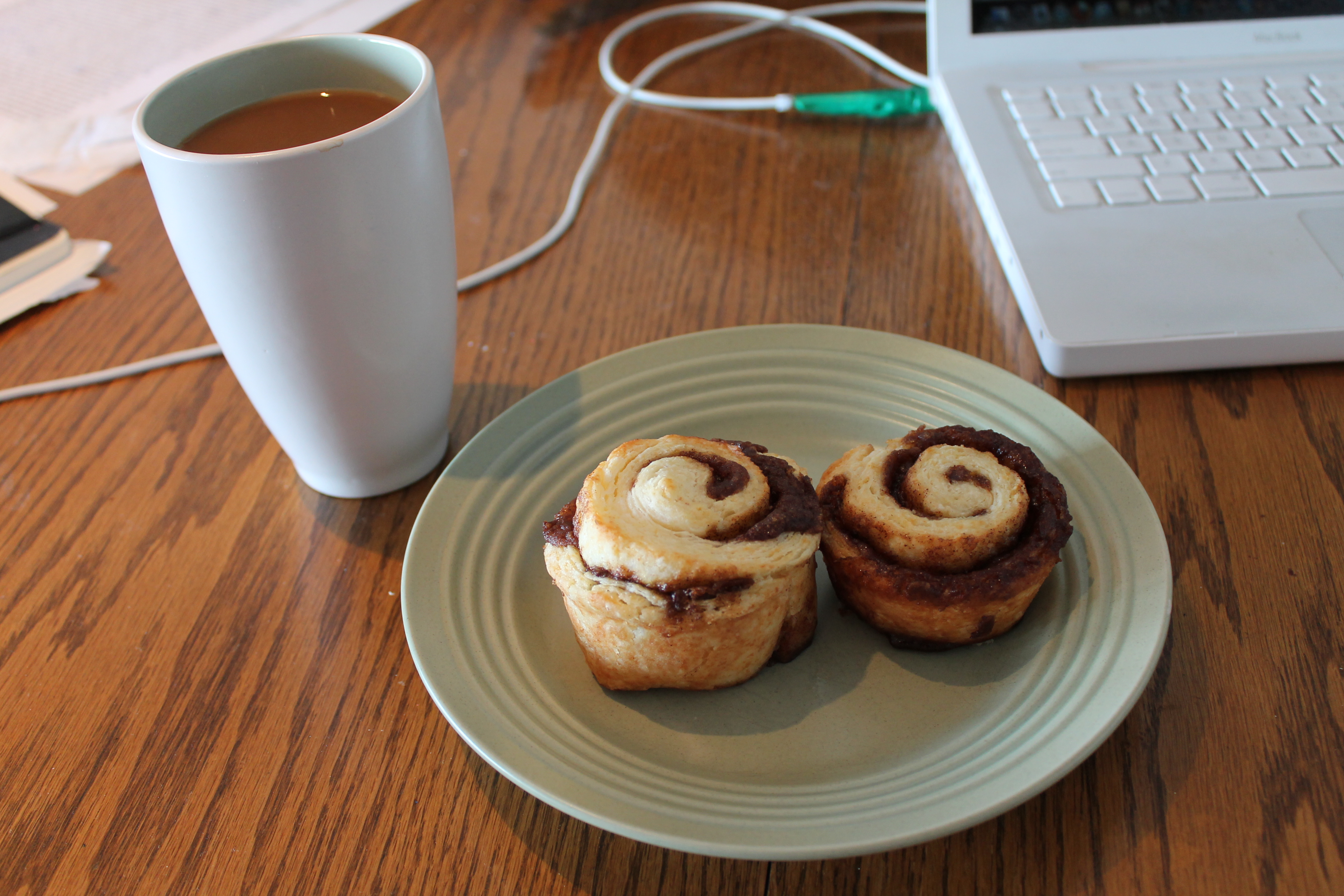 Hot coffee, homemade cinnamon knots, and green electrical tape on my laptop.