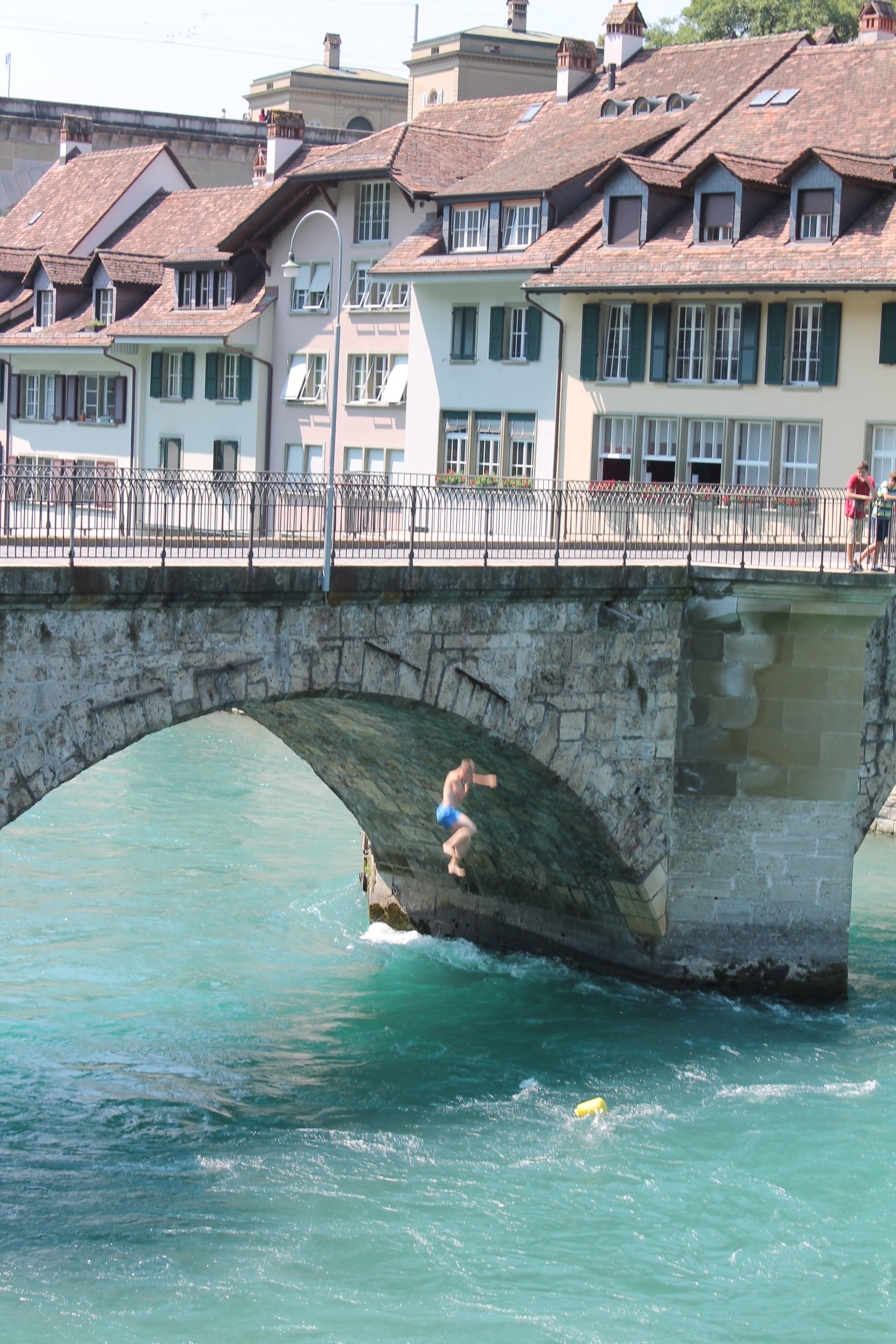 The water is glacial, coming down from the Alps, but the river is shallow enough that it gets quite warm. If the current weren’t so strong, you’d be able to stand in many places. The river is clear and clean and the same brilliant turquoise colour as so many lakes in the Canadian Rockies. It was perhaps the most unique way I’ve ever viewed a city, the old buildings lining the shores on each side. Mostly, you simply float and let the river take you, though when you turned a corner, the current wanted to push you to shore. We floated past the bear park and under two bridges, people above pausing to watch us. Some brave (or foolish) teenagers jumped from above.