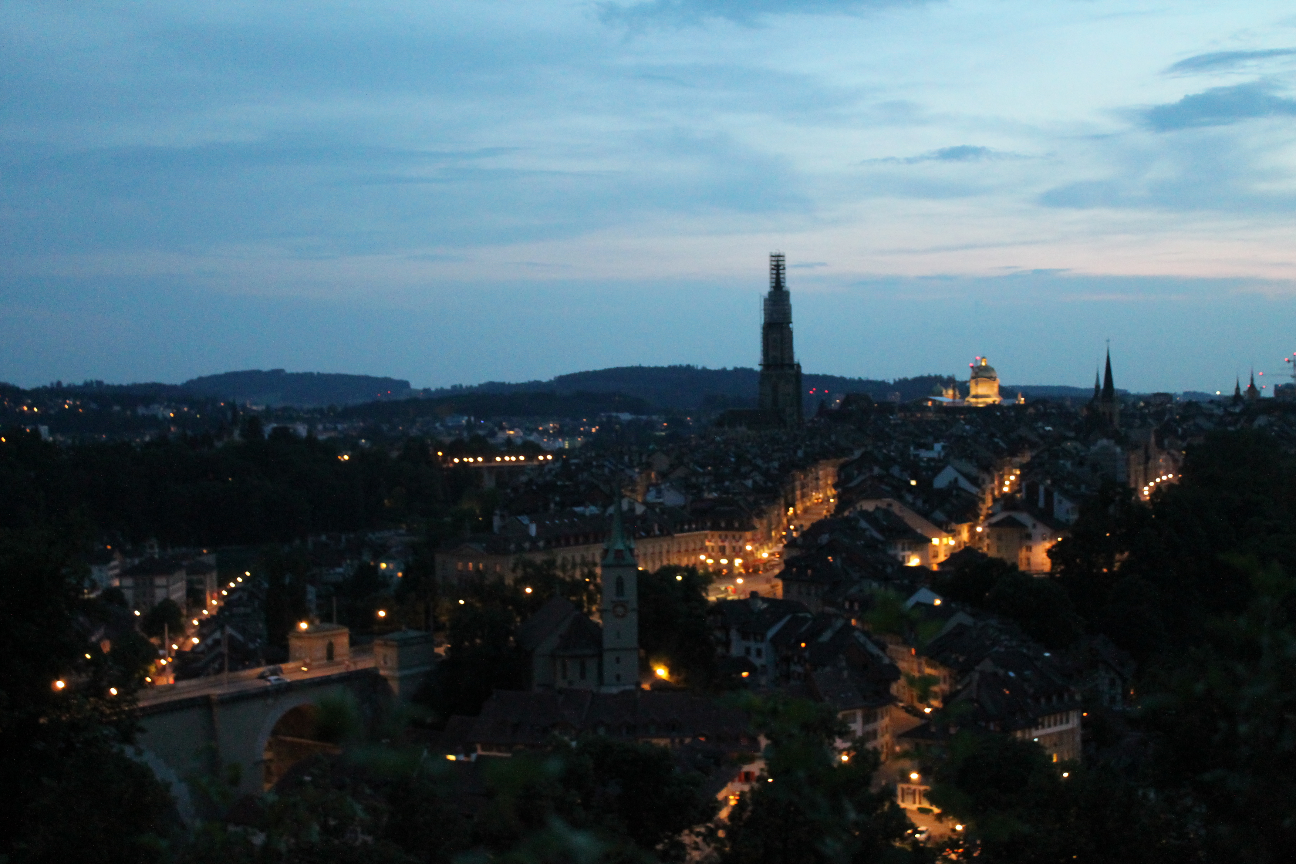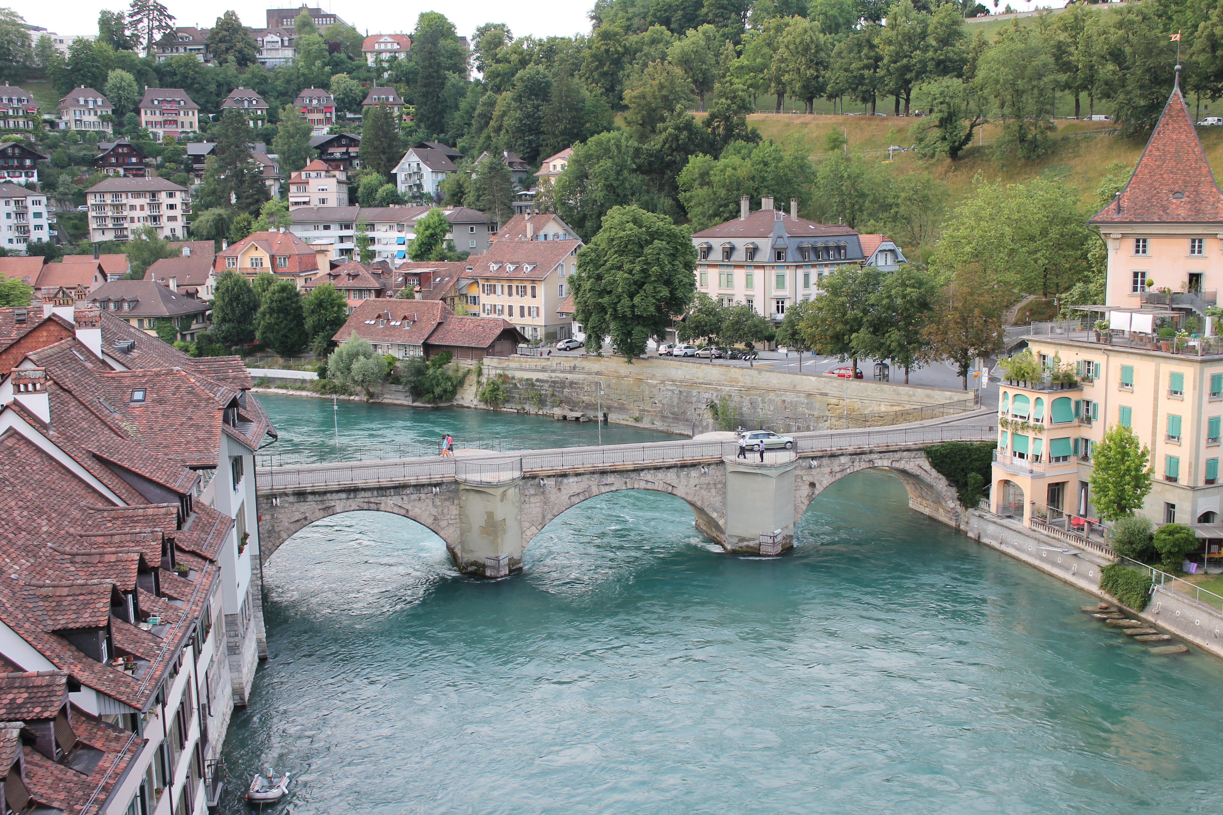 We arrived in Bern two hours later than expected but it was only 9am so we wandered around and looked for a place to eat the breakfast we had packed along. In a pretty garden by Munsterplatz, surrounded by a stone wall and overlooking the River Aare, we ate breakfast. Bread, cheese, and sausage from Fritzlar. We looked over the Old Town as I fed bits of banana to the sparrows.