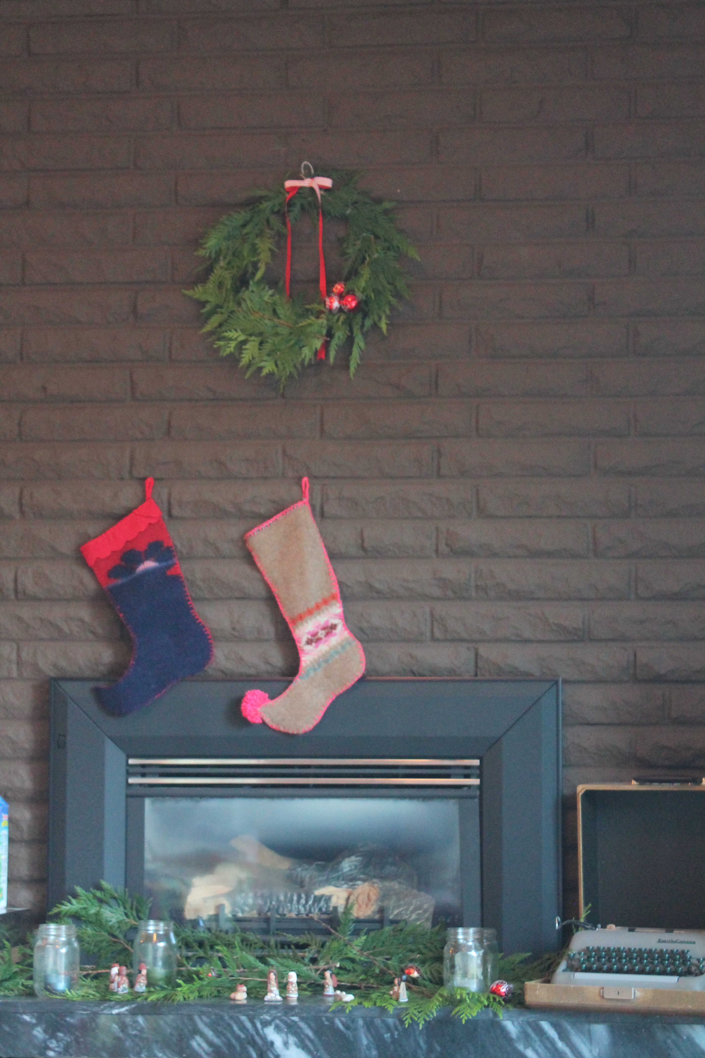 While we’ll wait a week or so to get our tree, December 1st a few decorations went up around our place. We hung our stockings with care above the fireplace.