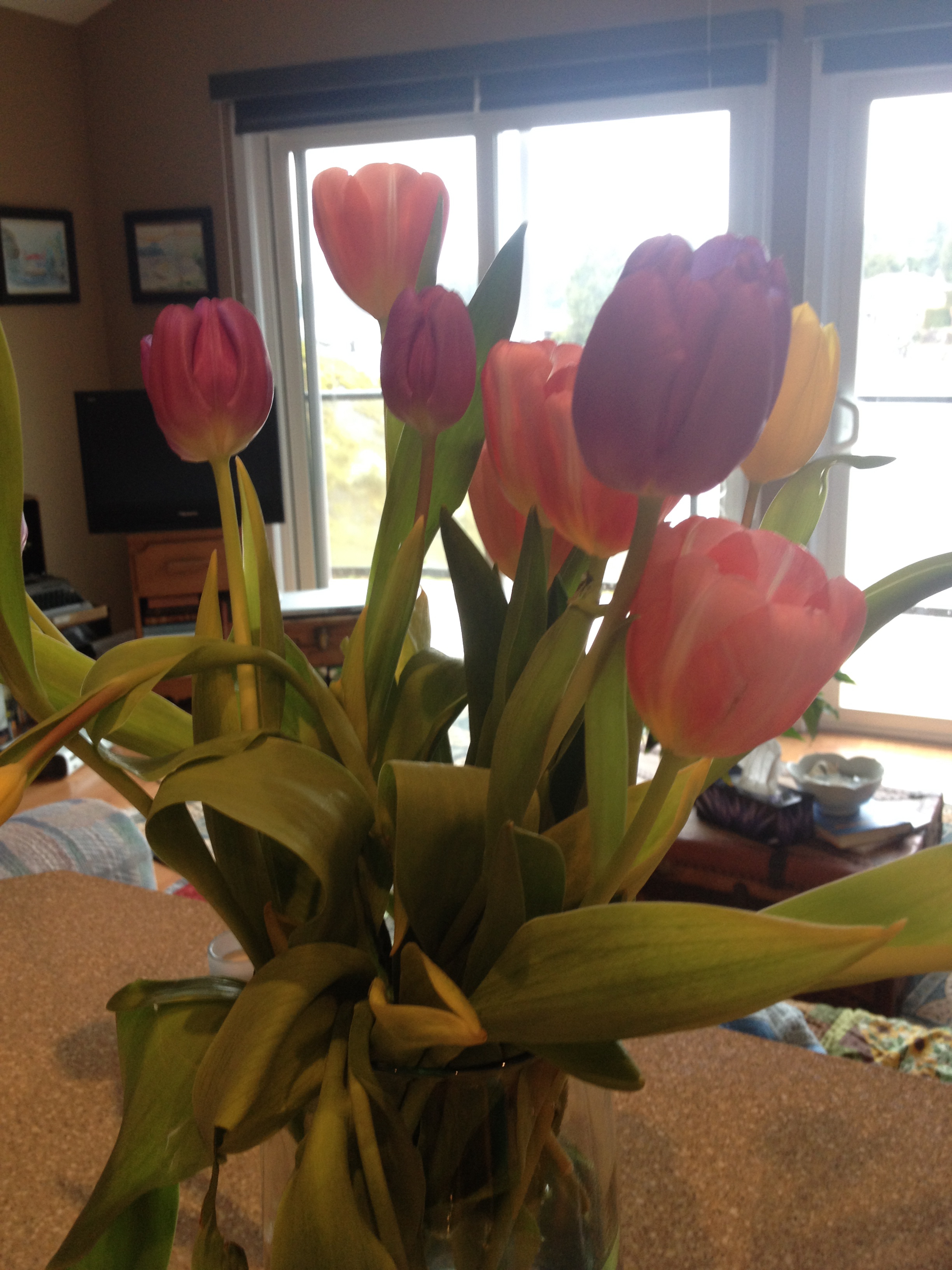 I’m holding on to my loved ones, to the myriad of blessings in my life. I’m holding on to the tiny happinesses that surround me each day. The sound of rain on my bedroom window. The seagulls who line up in rows on driftwood logs in the bay. A bouquet of tulips in my kitchen. The way it feels when my husband takes my hand while he’s driving.