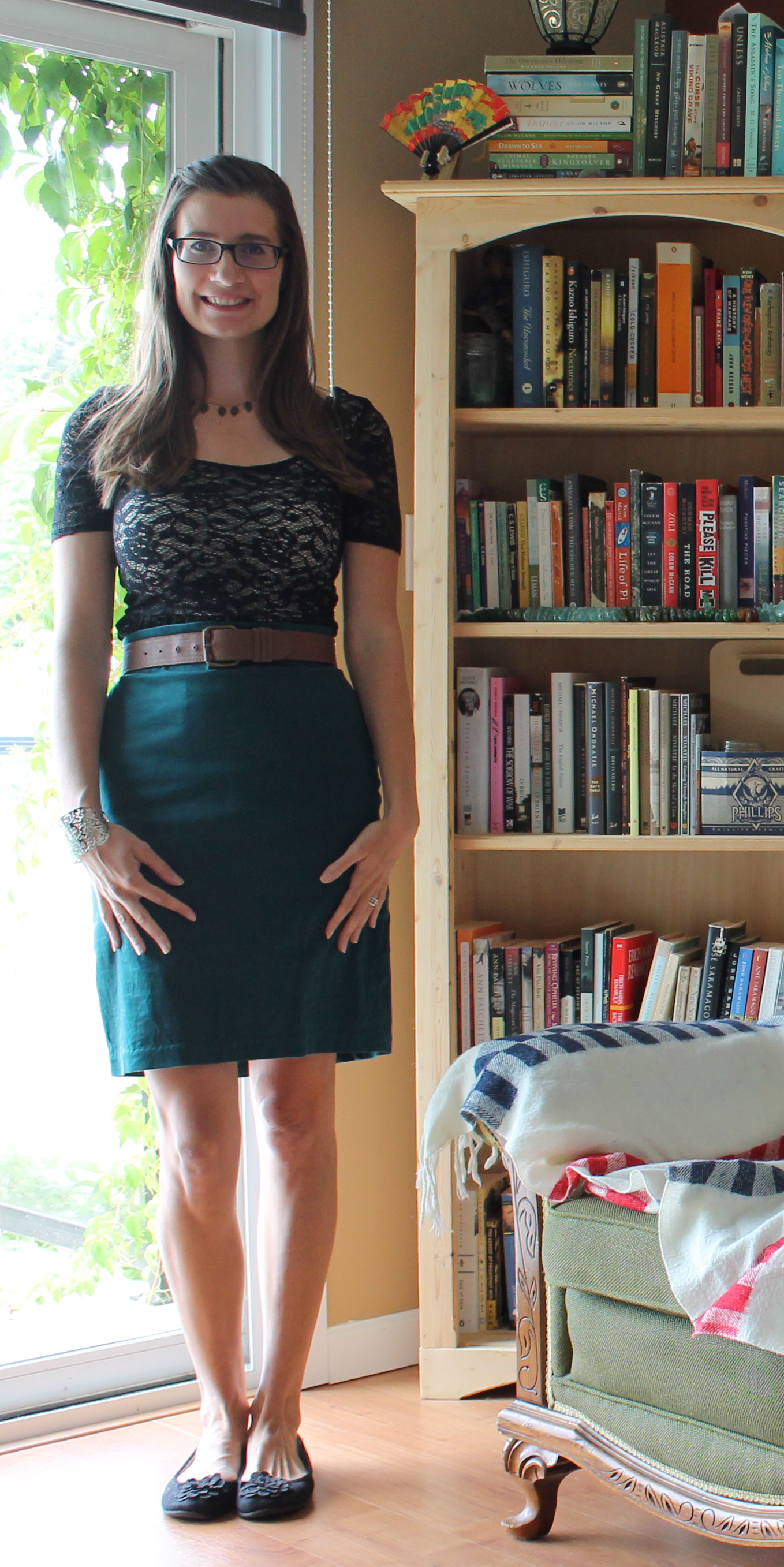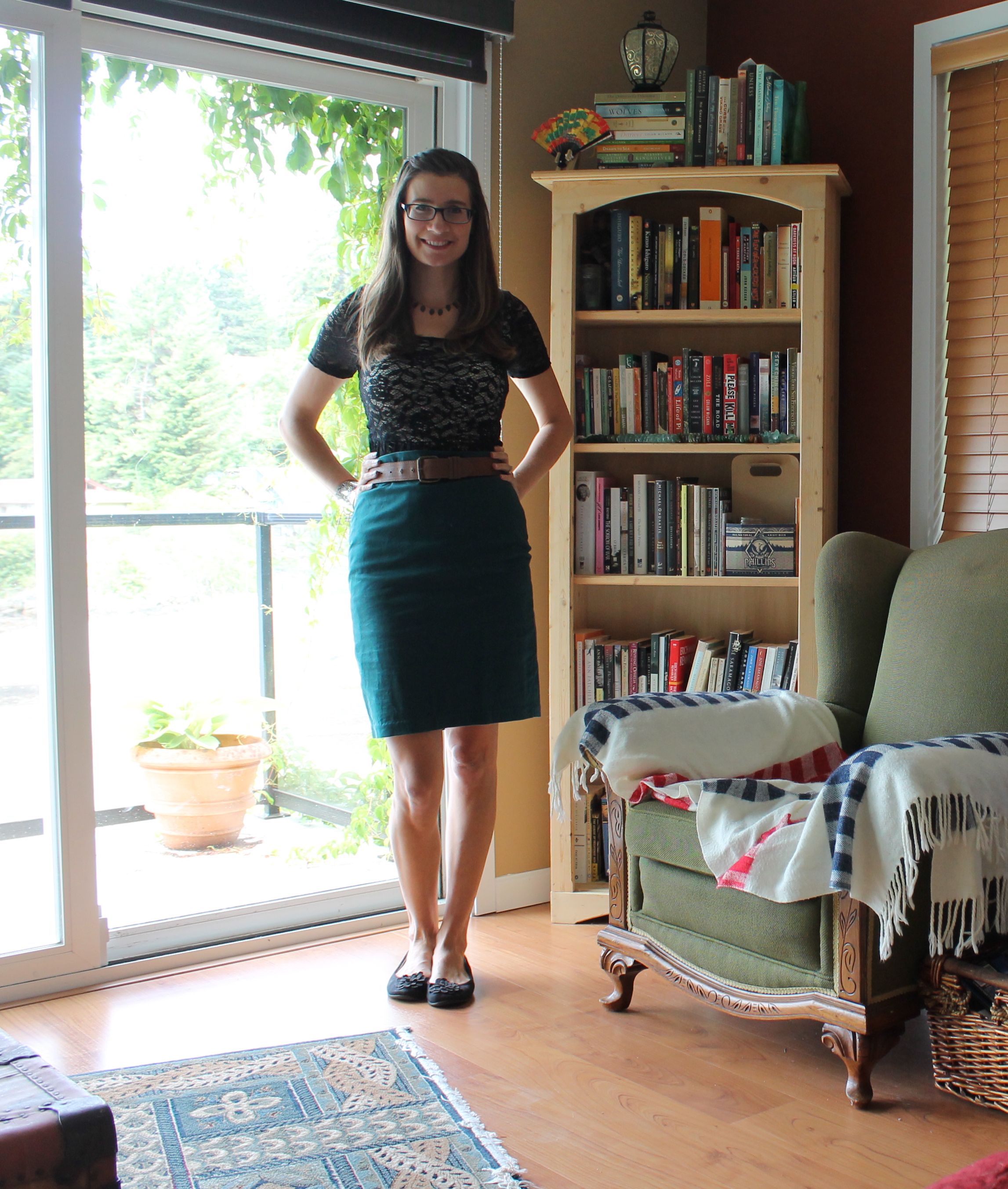 I think it works. The bottom of the dress is not super full so it tucks in under my green skirt and (hopefully) just looks like a lace top. It had to be a skirt that was high-waisted because the waist on the dress is a little higher and I didn’t want it to show. I don’t love the belt (I’m not sure about the brown and I think the style doesn’t quite match) but it felt necessary in order to cover that transition better. I’m eager to hear others’ opinions – do you think this works or is a skirt over a dress ridiculous?