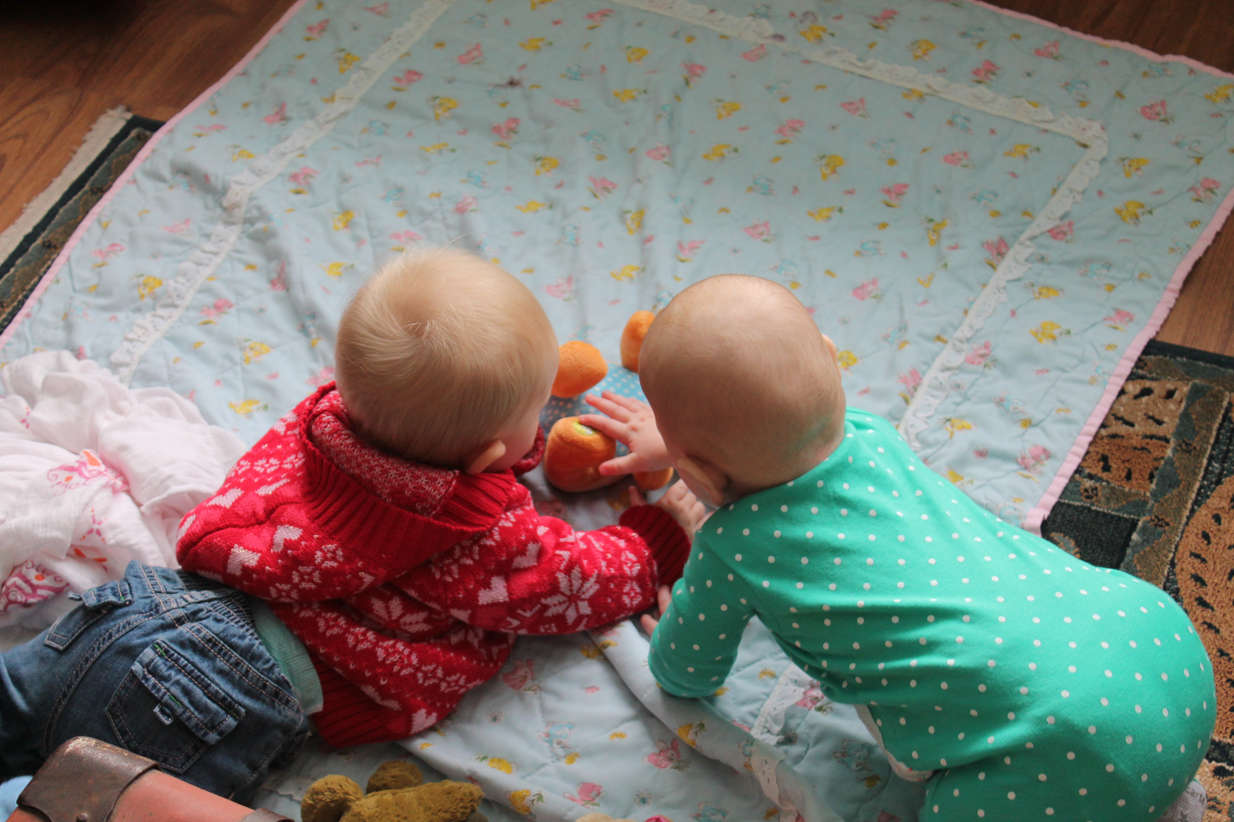 This is a photo of the first time Pearl took a toy from another child. It’s hard to tell if she’s emotionally attached to her toys or if she just wanted to play with it at that moment and doesn’t understand being nice to others yet.