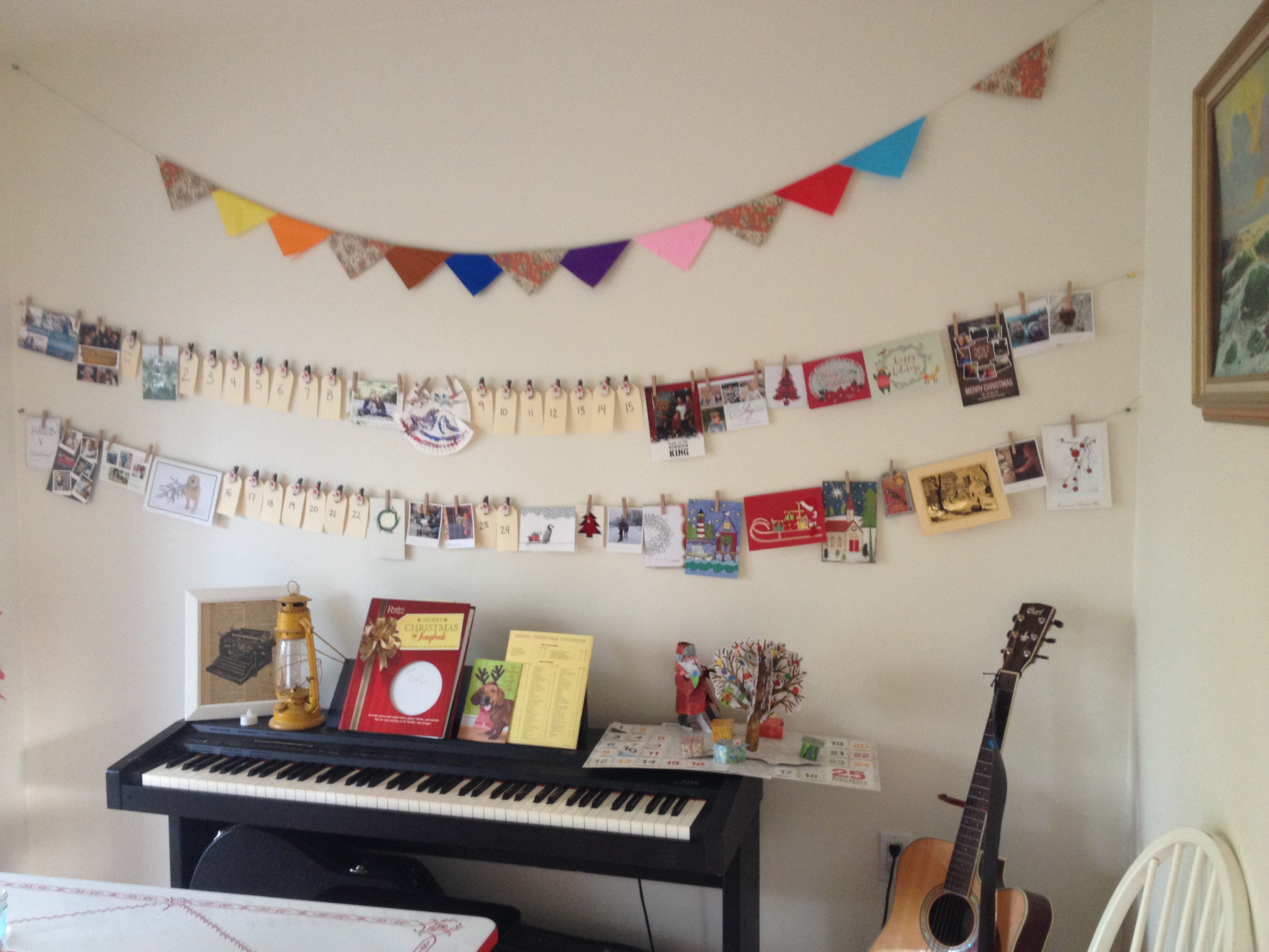 Every day there is a different small activity we do together. We’ve baked cookies, hunted for pinecones to decorate the house, made paper stars, rung bells for the Salvation Army, and attended get togethers at friends’ houses. There have been a couple of gift openings – all books.