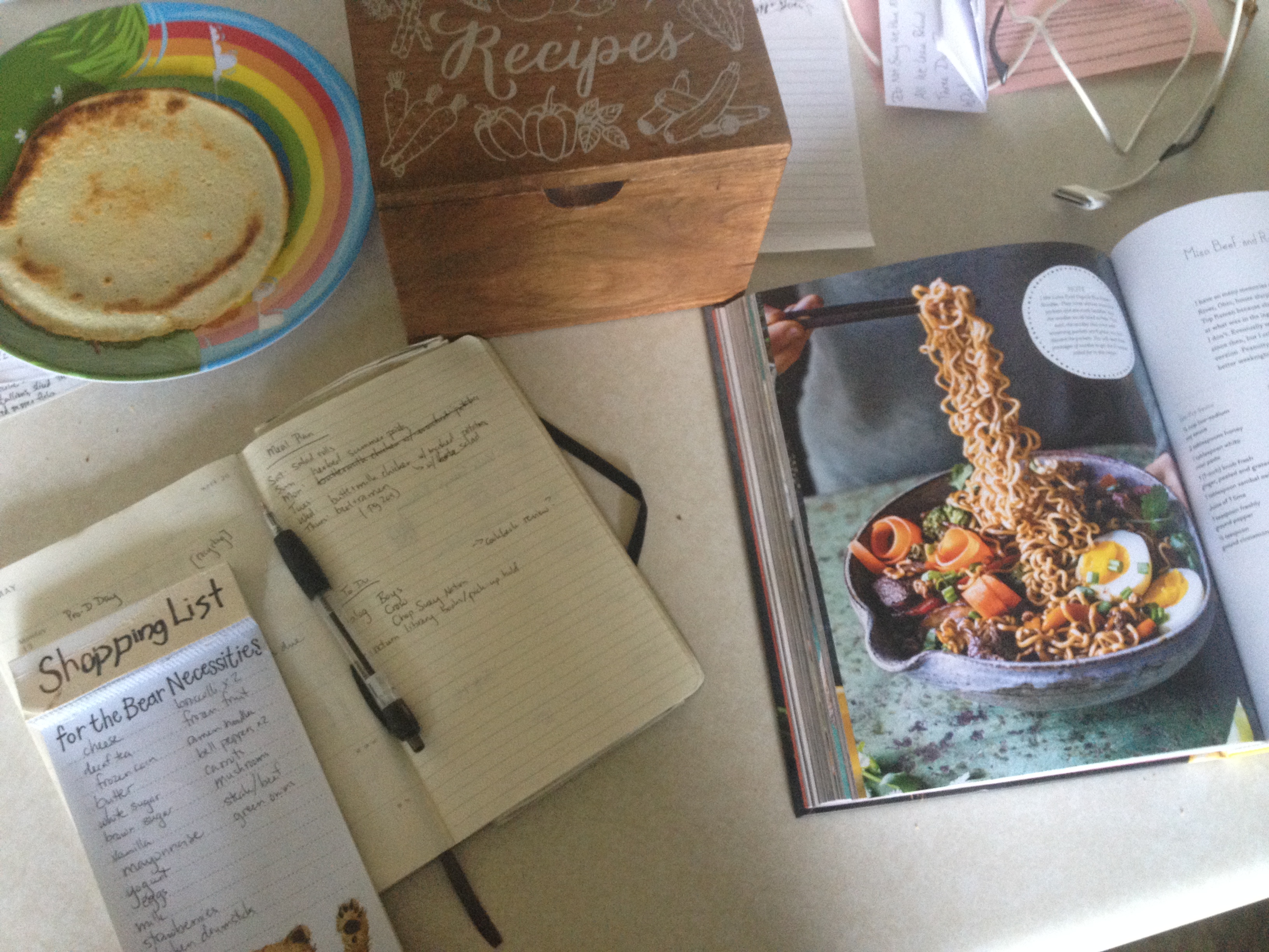 This is a picture of my kitchen counter on a Saturday morning. Cooking pancakes (one cooling on a plate for Pearl) and planning our meals for the coming week. We do our big grocery shop once a week, usually on Saturday mornings. I cook five or six of those meals. (I’m the one who is at home with the kids most days; Peter is a great cook but he just doesn’t arrive home in time to make dinner on weekdays.)