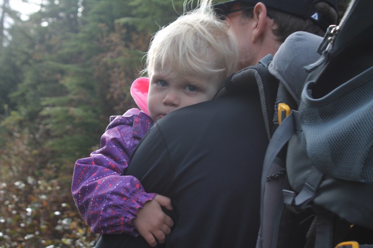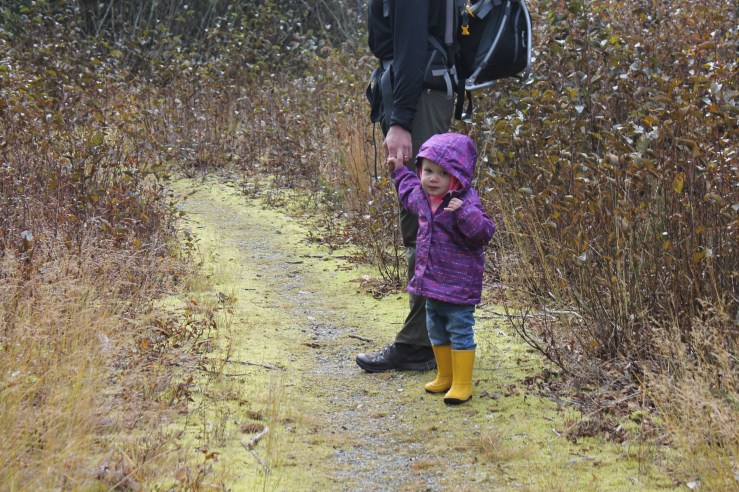 Rose was not so happy at the beginning (I made her leave her baby in the car) but cheered up as we went and ended up walking a good portion of the trail, even over roots and through mud. Our girls are good walkers but motivation is about 90% of the battle. Look closely at that third photo and notice that Peter is carrying both of them.