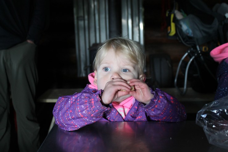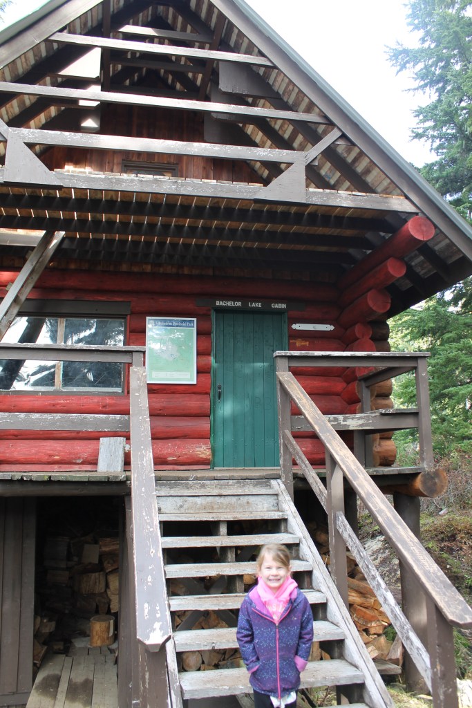 At Bachelor Lake there is a small log cabin where hikers can camp overnight. On our way up we passed a family who had spent the night and so when we reached the cabin, it was still warm from their fire. The girls loved climbing the ladder up to the sleeping loft and we stopped for snacks and a short break.