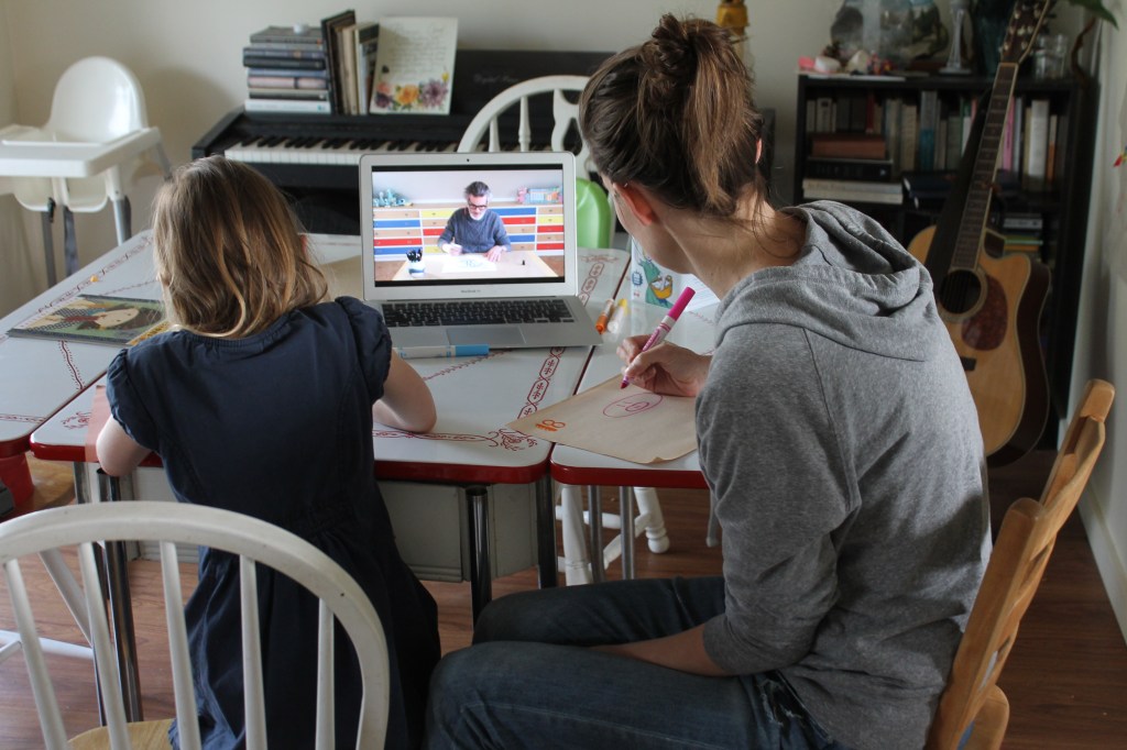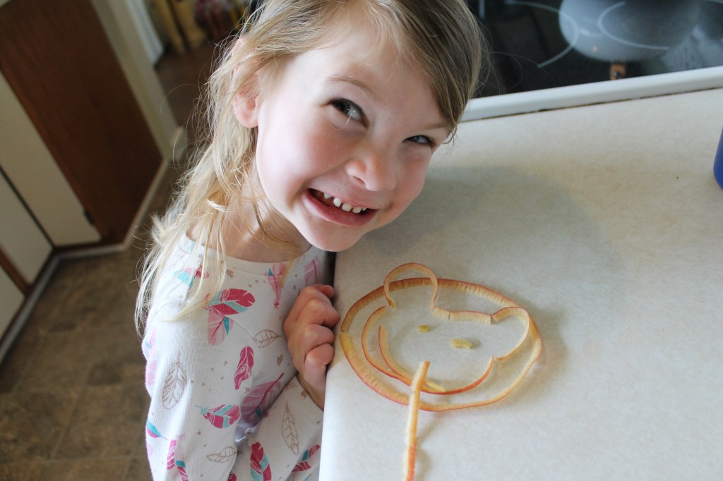 Without our regularly scheduled activities, we are working on other creative ventures. We tried our hand at making apple chips in our oven and then spent quite a while playing with the apple peels. We measured to see how long they were and then made animals out of them. Pictured above left: Pearl and her apple peel panda. On the right is Pearl and I following along with a Mo Willems’ Lunch Doodle. Pearl was even inspired to make her own video. We’ve also joined in on a virtual music class each week.