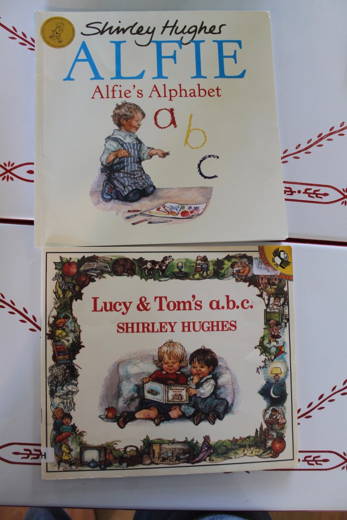 We have a handful of picture books by Shirley Hughes, including several in the Alfie series. Rose in particular loves them (possibly because Alfie’s little sister is named Annie Rose!) Pearl likes looking through Alfie’s Alphabet and recognizing the scenes from other books we have. I find something very soothing about reading Shirley Hughes and the soft, detailed pictures.