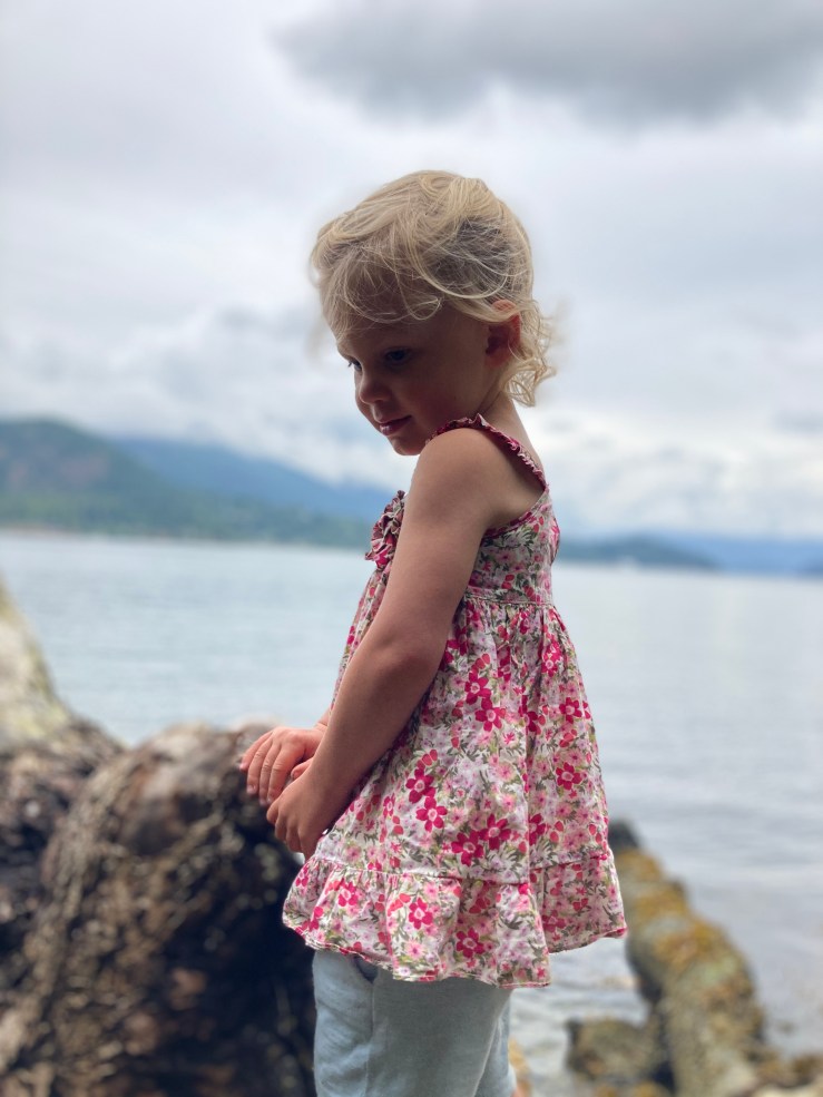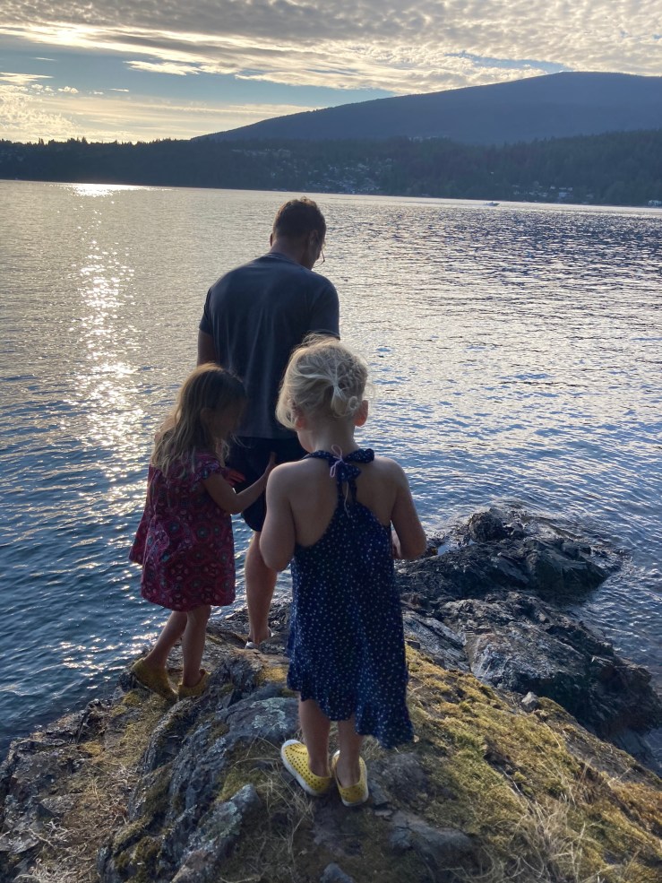 We spent lots of time on the dock, Pearl and Rose armed with dollar store fishing nets in an attempt to catch the little fish. (Pearl caught one and I caught one.) The girls also loved exploring the beach and particularly clambering over rocks and logs. There was one spot on the beach that we visited each day and Pearl collected limpet shells.