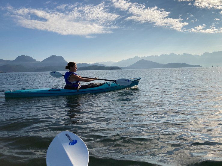 Our solution was to borrow a single kayak, which I paddled, loaded with most of our stuff. Peter took both girls across. As always, we launched early in the morning when the water is calmest. This meant that I was changing the girls out of their pyjamas on the beach while Peter loaded the kayaks but we had a beautiful crossing.