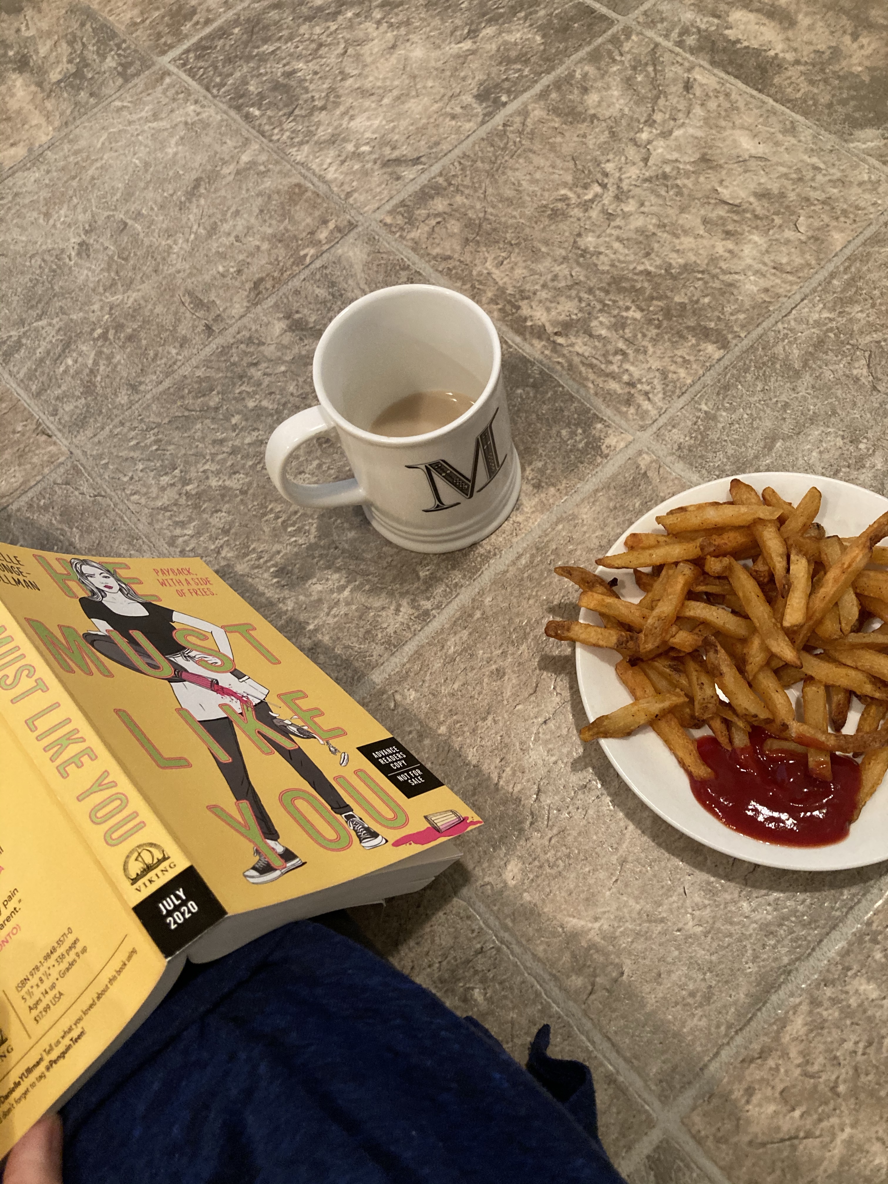 I didn’t notice the tagline of this young adult novel – “Payback, with a side of fries” – when I was sitting on the kitchen floor, hiding from my three-year-old while eating leftover fries but this picture seems fitting.