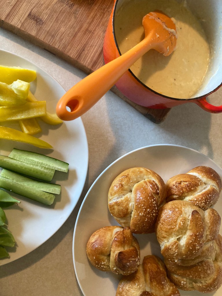 • Sourdough pretzels with cheese dip (and veggies so we don’t get scurvy):
