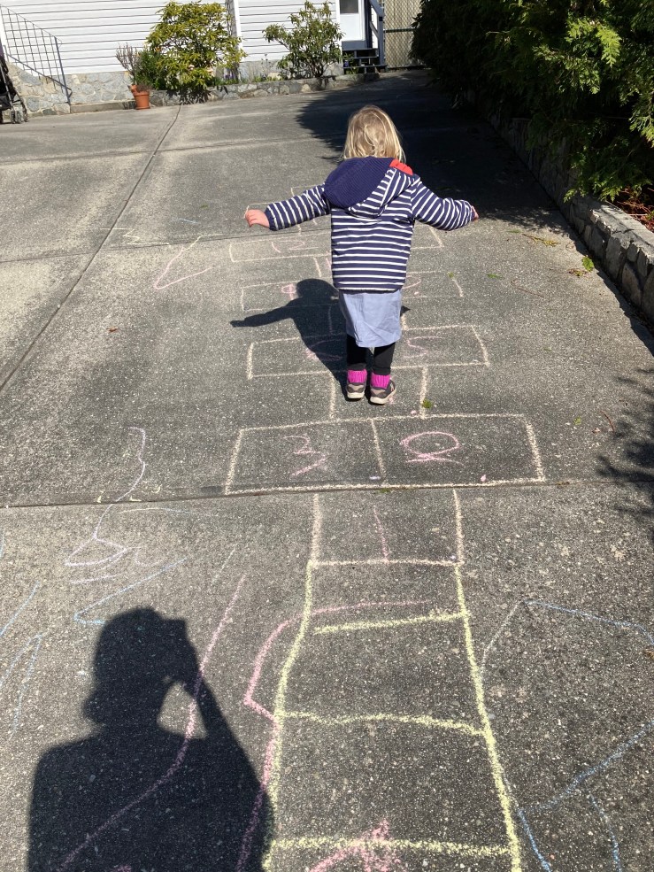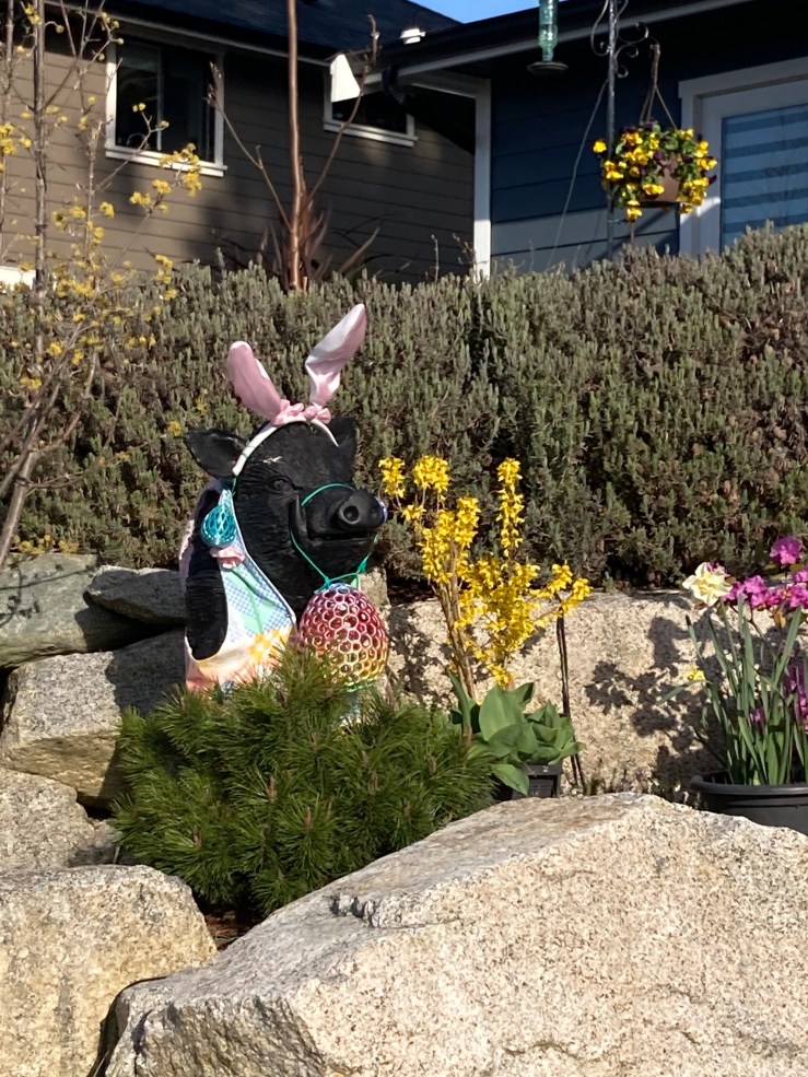 - On our weekly walk to the library, Rose and I saw our friendly neighbourhood pig all ready for Easter, and stopped to do another Story Walk through the garden, put on by the library. (We did the story walk three times because Rose liked it so much. The third time we were accompanied by some friendly teenagers on lunch break.)
