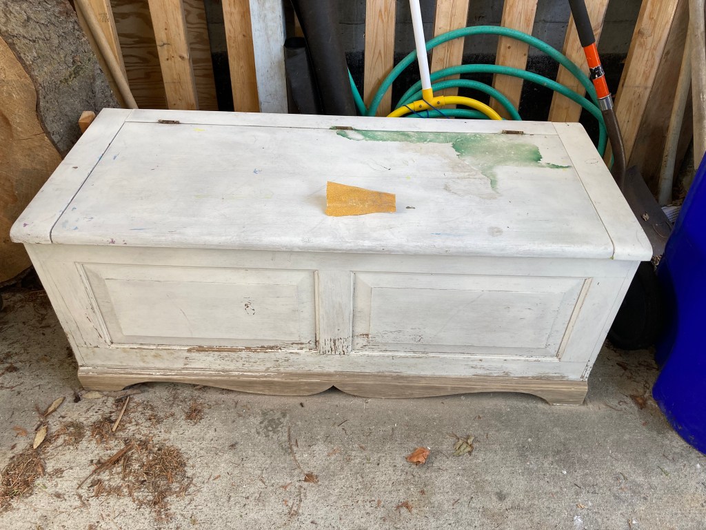 We got this chest for free and have kept it outside, storing outdoor toys and tools in it. We’ve been talking about bring it inside so I started sanding it one afternoon while the girls played outside and now we’re going to fix it up a little and bring it indoors.