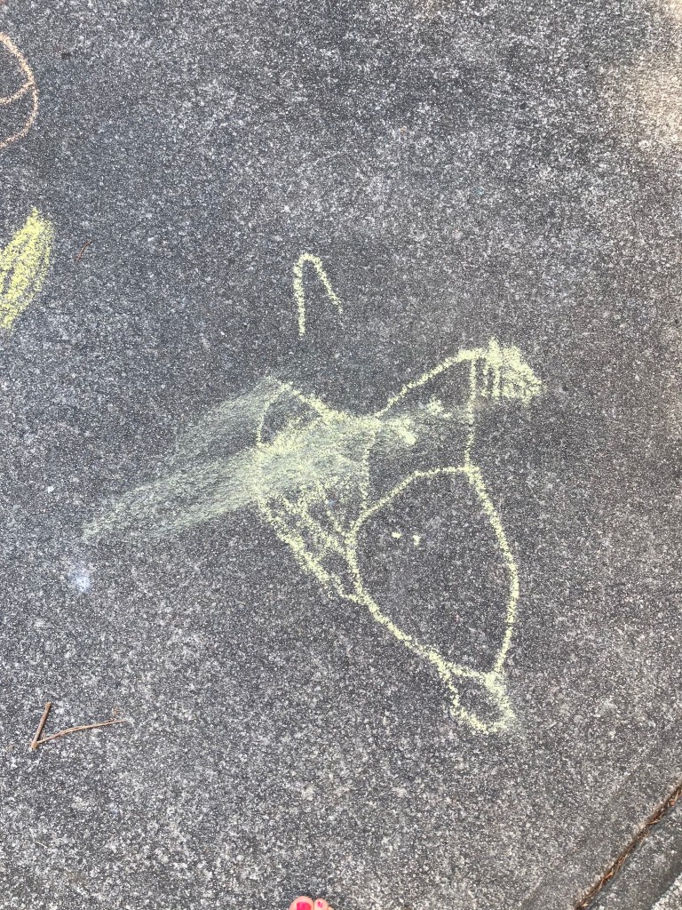 - Rose’s developing artwork. On the left is a chalk drawing of a beaver that she did on the driveway. On the right is a picture she drew. When I asked her about she said, “It’s hundreds of eyes watching the dwarves.” I questioned her a little bit about this, not understanding quite what she was getting it until she said it was “When Bilbo said, ‘Look, wolves!” She was remembering the scene in The Hobbit when the dwarves hide in trees, surrounded by wolves.