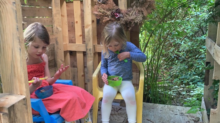 • We had ice cream for dessert one evening (not a common occurrence around here) and the girls promptly scurried out back to enjoy it in their playhouse: