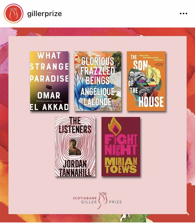 - The shortlist for this year’s Giller Prize. I’ve only read 2 of the books so far (What Strange Paradise and Fight Night) but am waiting on a library hold for Glorious Frazzled Beings and have already decided that I will read whatever the winner turns out to be. (If I haven’t read it already.) My personal vote at this moment goes to What Strange Paradise.