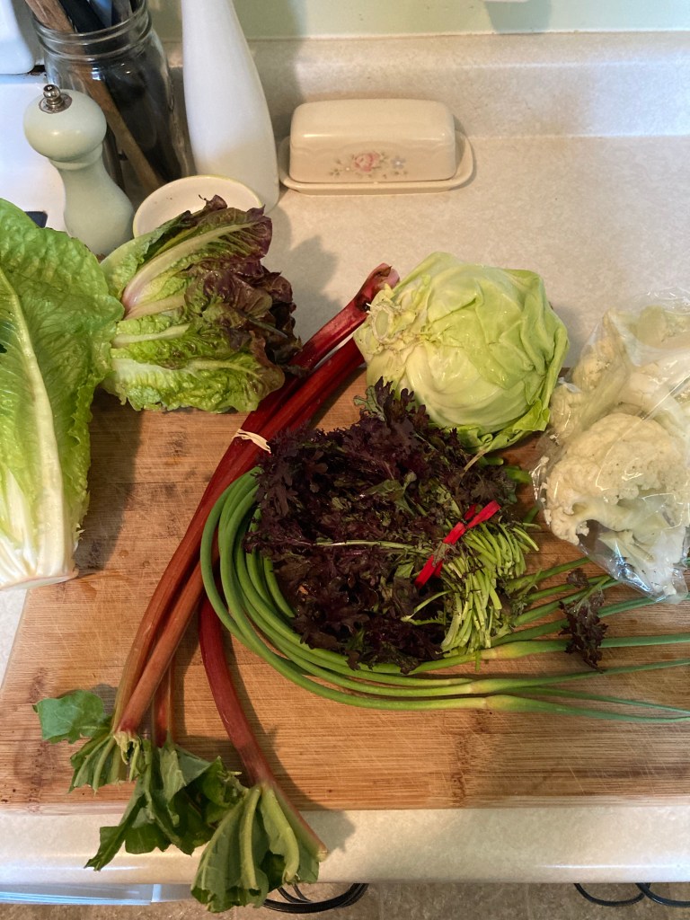 1. They warned us ahead of time that there were going to be a lot of greens! For the mixed greens I have just been making big salads. I use the kale in smoothies since we also have kale from our garden so it’s really more than we can reasonably get through in a week! We got a lot of cauliflower so I think I’m going to roast then and I used the potatoes and green onions in a frittata. Not sure what to do with the multitude of garlic scapes! Have you made anything exciting?