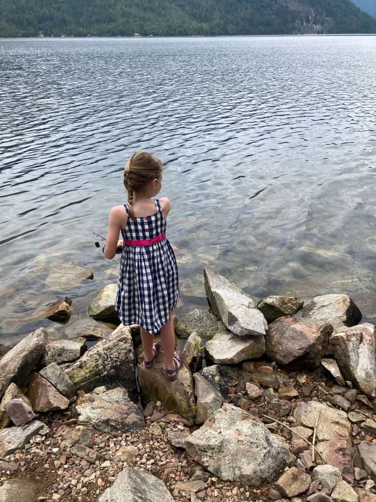 Christina Lake was just a short walk from our site and we spent time there, attempting to fish, watching chipmunks and ground squirrels, and swimming at the sandy beach.