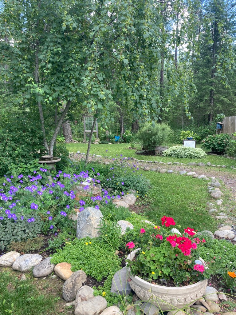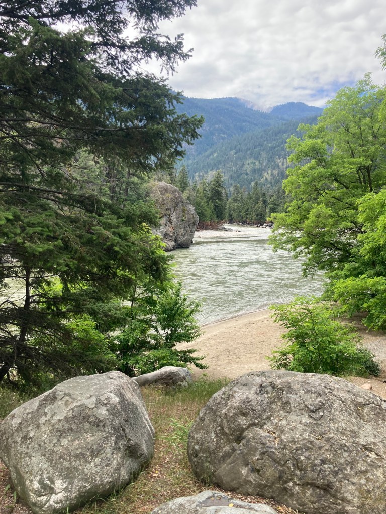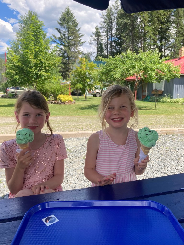 We stopped for lunch in Creston and then ice cream at Two Scoop Steve’s in Yahk. (Very generous ice cream servings!) There is also a lovely garden/river walk behind the ice cream place that we enjoyed.