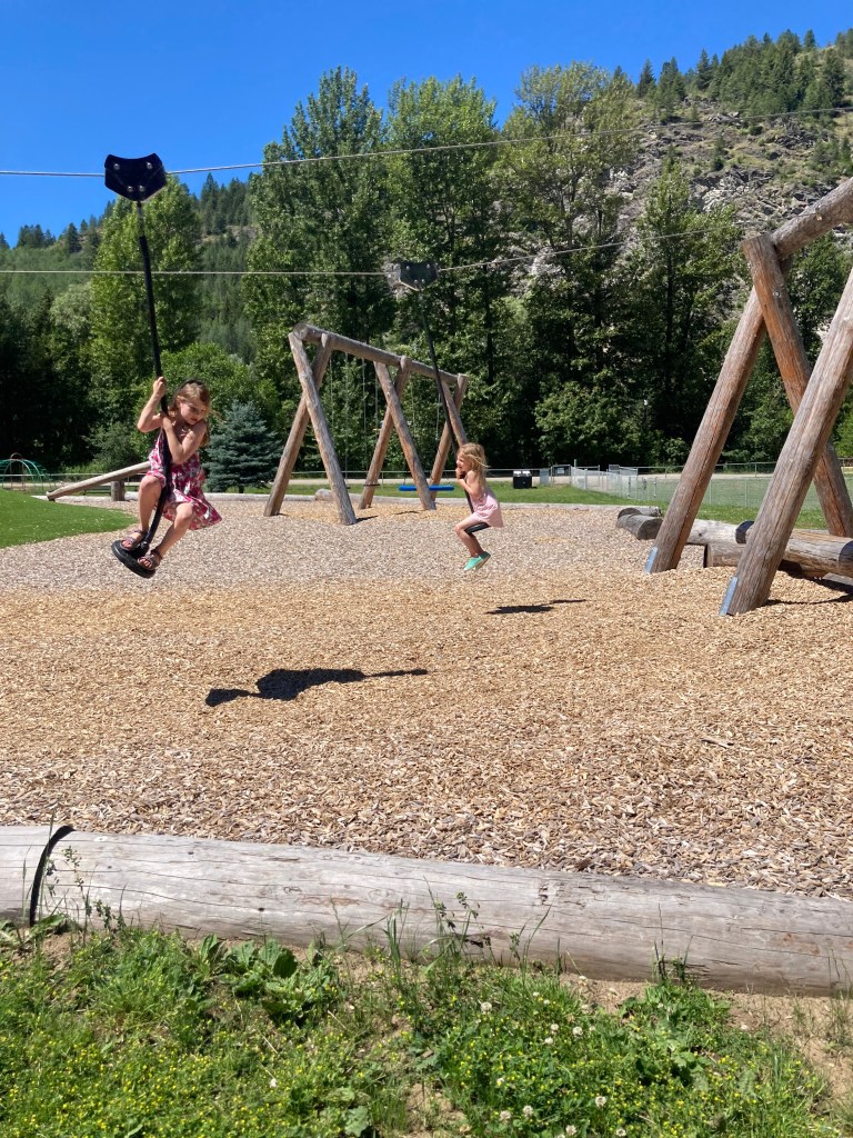 The next day we were back on the road. We got an early start and stopped in Castlegar for coffee. With the girls still in their jammies, people were particularly friendly to us! We made a lunch stop in Greenwood where we found a really cool playground. It was too hot to sit on the teeter-totter but the zipline was a big hit.