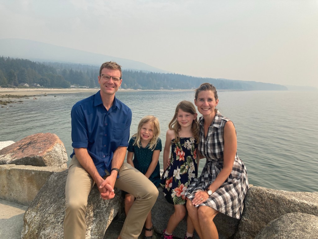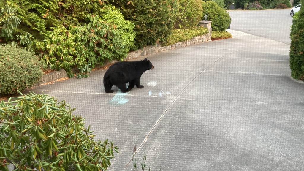 In other excitement, one evening Peter and I were chatting in our kitchen, shortly after the girls went to bed, when we glanced out the window to see a black bear walk across our driveway. We could hear some neighbourhood kids still outside so Peter grabbed the bear spray and went out to make sure they went indoors. The bear ambled into the neighbours’ front yard and then came back through the bushes into our driveway. (Peter hopped over into the yard of our neighbour on the other side rather than try to sneak past the bear.) The bear came into our carport, sniffed our (empty) garbage and compost bins, and came right to the bottom of our front steps. I took a video from the kitchen window and realized this was the closest I’d ever come to a bear.