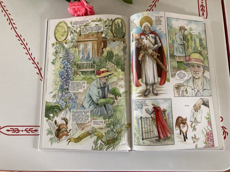 The humour largely exists in the juxtaposition of this larger-than-life, mythical figure of Galaad showing up on his white steed in the midst of a very ordinary English neighbourhood. There is a lot of meaning too though that comes across on the page without anything being said. We see the routines that Mrs. Whitaker has in her daily life and how she feels her days. We begin to understand how she misses her husband and how, perhaps, her life is not quite what she thought it would be. And we catch a glimpse of another woman who is perhaps making a choice to grasp life to its fullest.