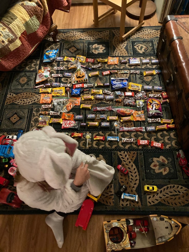 I always have mixed feelings about Halloween, as someone who didn’t grow up trick-or-treating and doesn’t much enjoy horror or being scared. This was our 4th year trick-or-treating in our neighbourhood (we didn’t go out in 2020) and I have come to love it as a community event. It’s been such a fun way to get to know our neighbours and share memories with the people who live around us. People we would never have met otherwise become familiar faces. We went again this year with our good friends and neighbours and our 4 kids had a blast collecting candy. Pearl and Rose love organizing their candy afterward too!