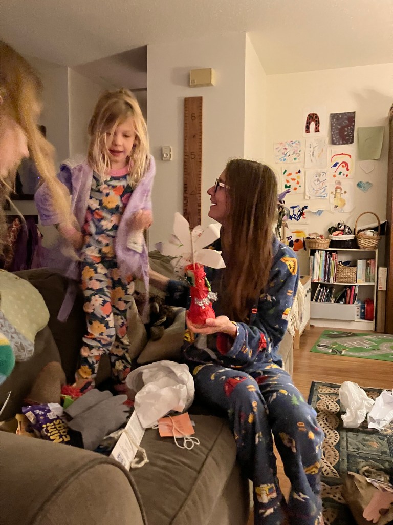 The rain washed away most of the snow before Christmas Day but we were kind of glad of it by then since it was making travel plans so complicated for so many around us. We started our Christmas celebrations with our church Christmas Eve service. Peter’s parents and his brother joined us. We had. a quiet evening at home with Chinese food and the traditional opening of new jammies. Pearl and Rose wanted to have a sleep-over (yes, they already share a room) and so fell asleep together on Christmas Eve in Pearl’s bed.