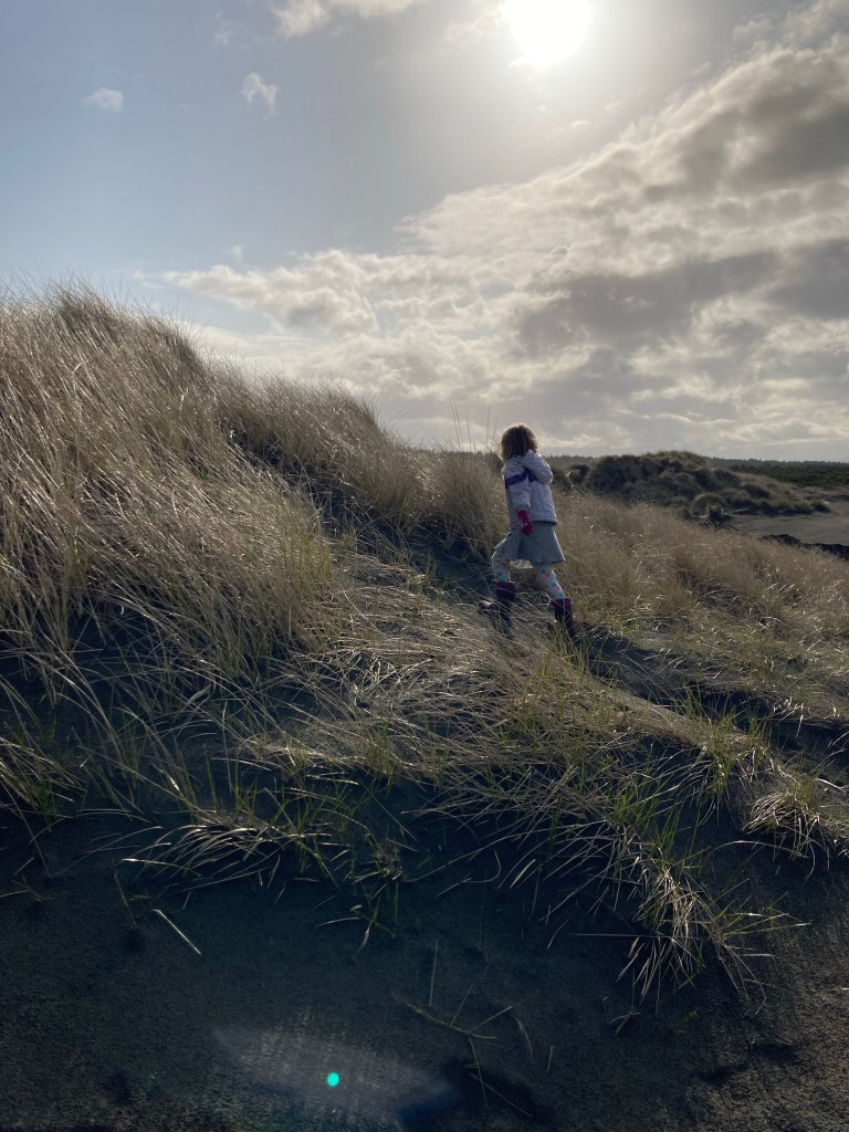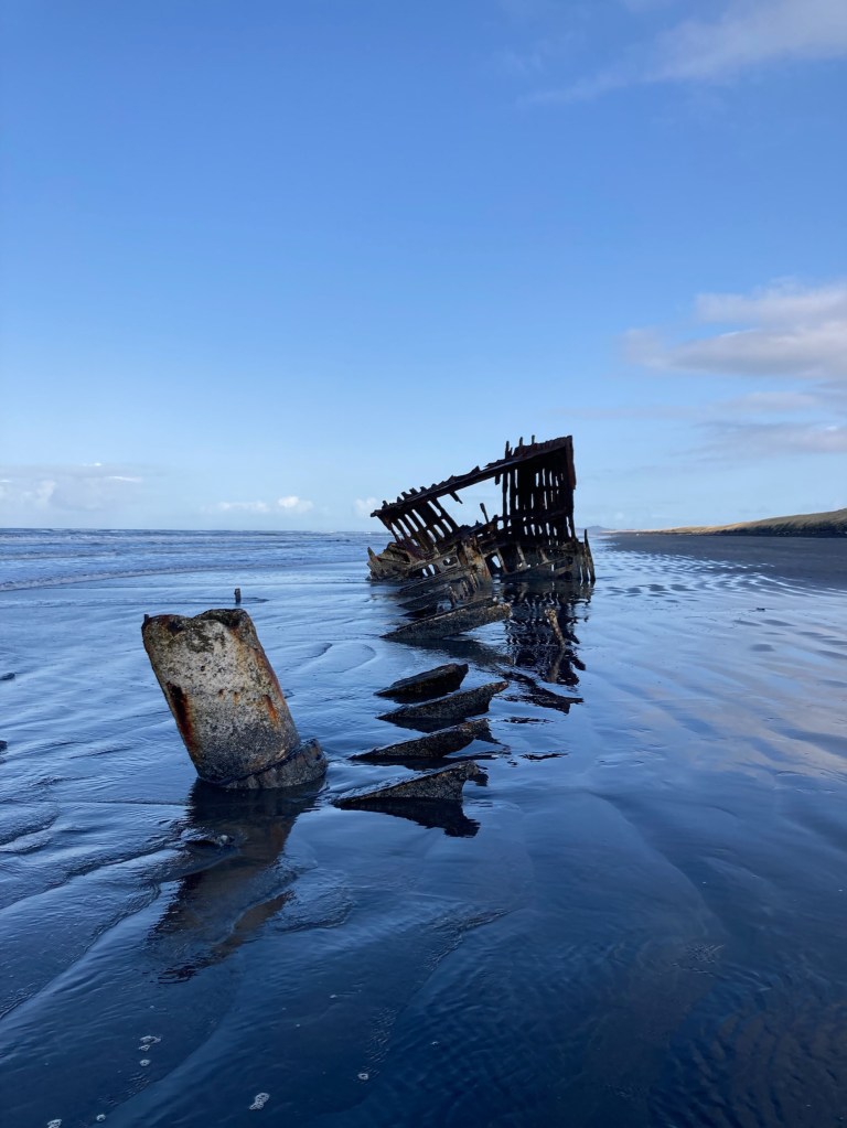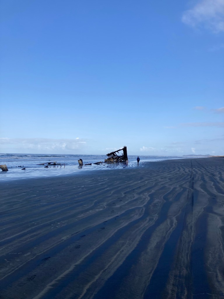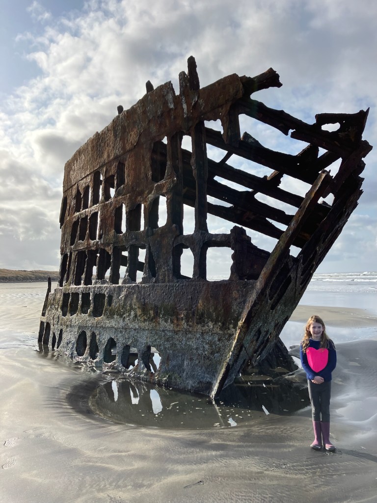 The next morning (Wednesday), we walked the trail from just behind our cabin to the beach nearby. This beach features the wreck of the ship The Peter Iredale, which wrecked on this beach over a hundred years ago. We spent time exploring the wreck, climbing the sand dunes, and playing games on the beach.