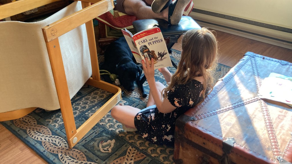 - Winnie continues to be a great addition to our family. She’s definitely a lot of work (see re-vamping our yard to protect it from her) and we’ve got a lot of training to work on but we are really enjoying her. It is particularly rewarding to see how much our kids love her. And she has already become part of our neighbourhood! Recently I was walking home from dropping the girls off at school; I had left Winnie at home that day and passing by a neighbour I had never spoken to before, she called out, “Where is your dog?” It always makes me feel a certain type of delight to realize that I am part of how other people see their neighbourhood. Like, there are the people I see regularly out walking or biking or whatever and I am one of those people for other people! How delightful!