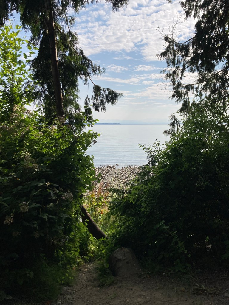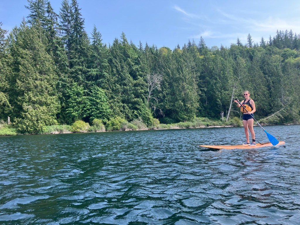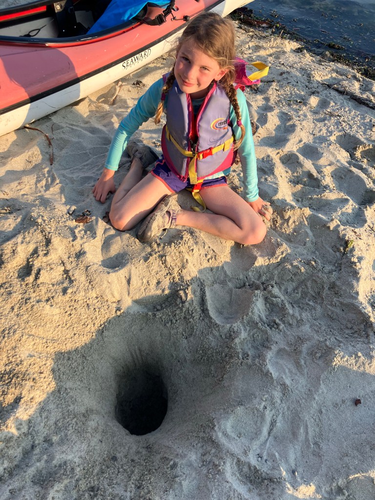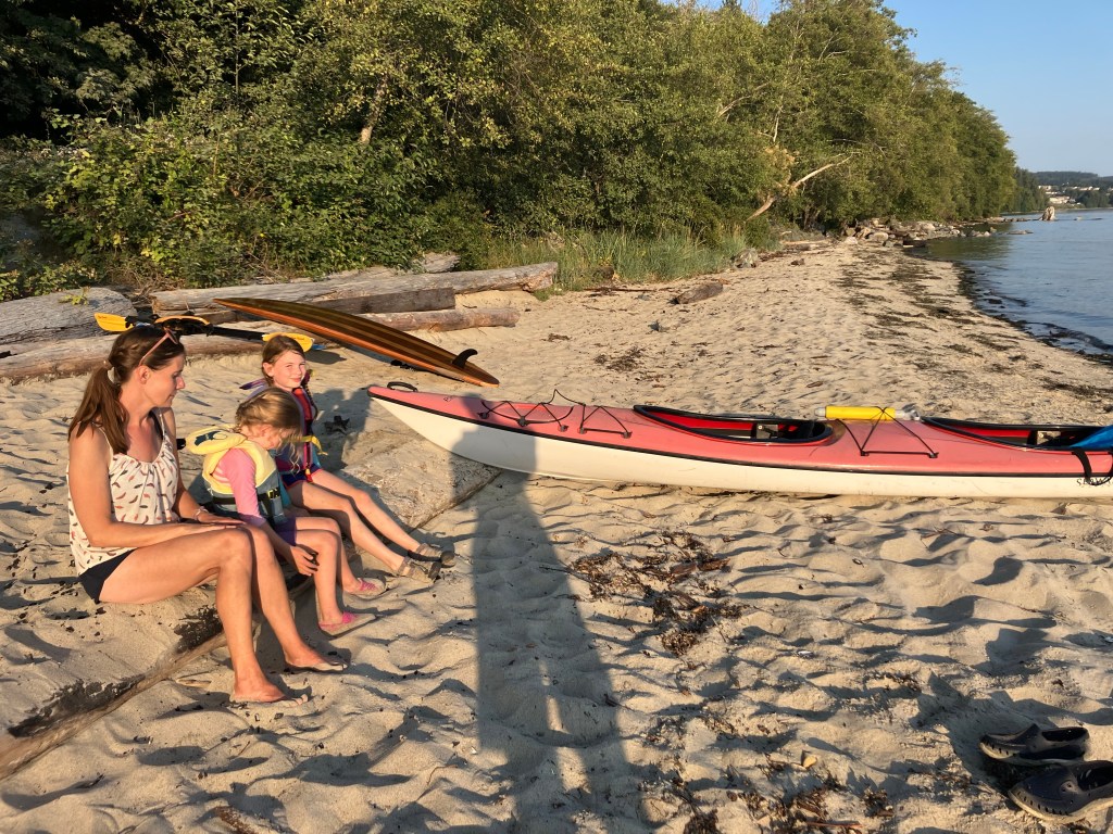 Since we’ve made several visits to Powell River in recent years, we have a few spots we like to go to. On our second evening we paddled to First Beach to play in the sand.