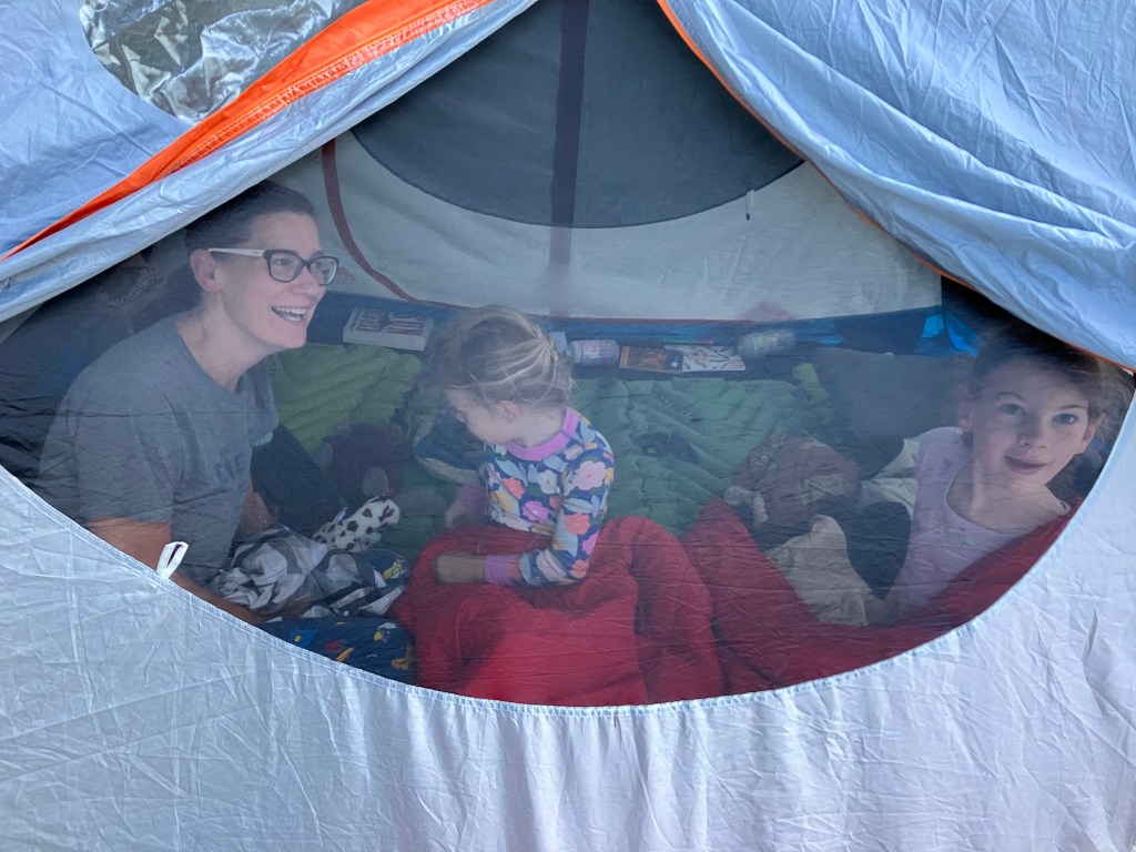 I know I said it last year but our “investment in future fun” (as we used to call camping with little kids) pays off more every year. Each summer we hone our family camping experiences more – gear, meals, timing – and each summer it gets easier with our kids. This year we enjoyed kids who could run to the playground on their own or explore an island on their own. Kids who can swim with minimal assistance. A big kid who reads chapter books. This year we also sent the girls into the tent earlier to read and colour while Peter and I sat out on the beach to chat and have a drink together before sleep.