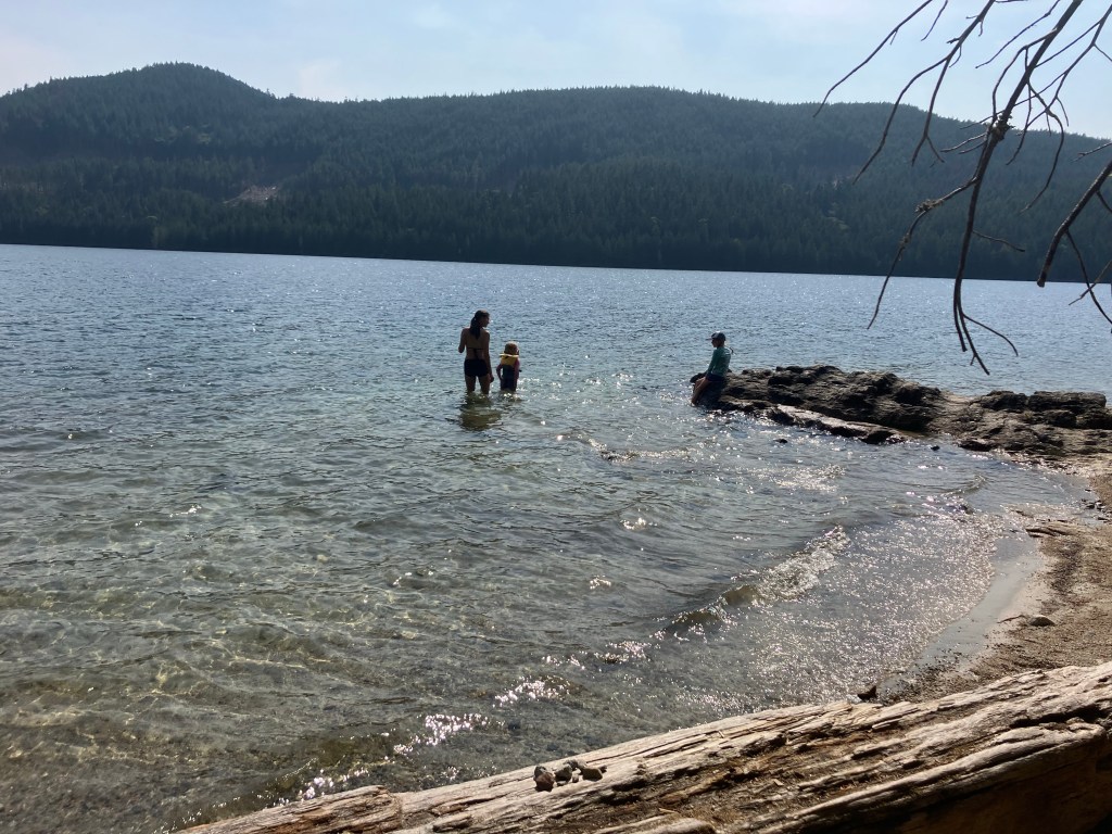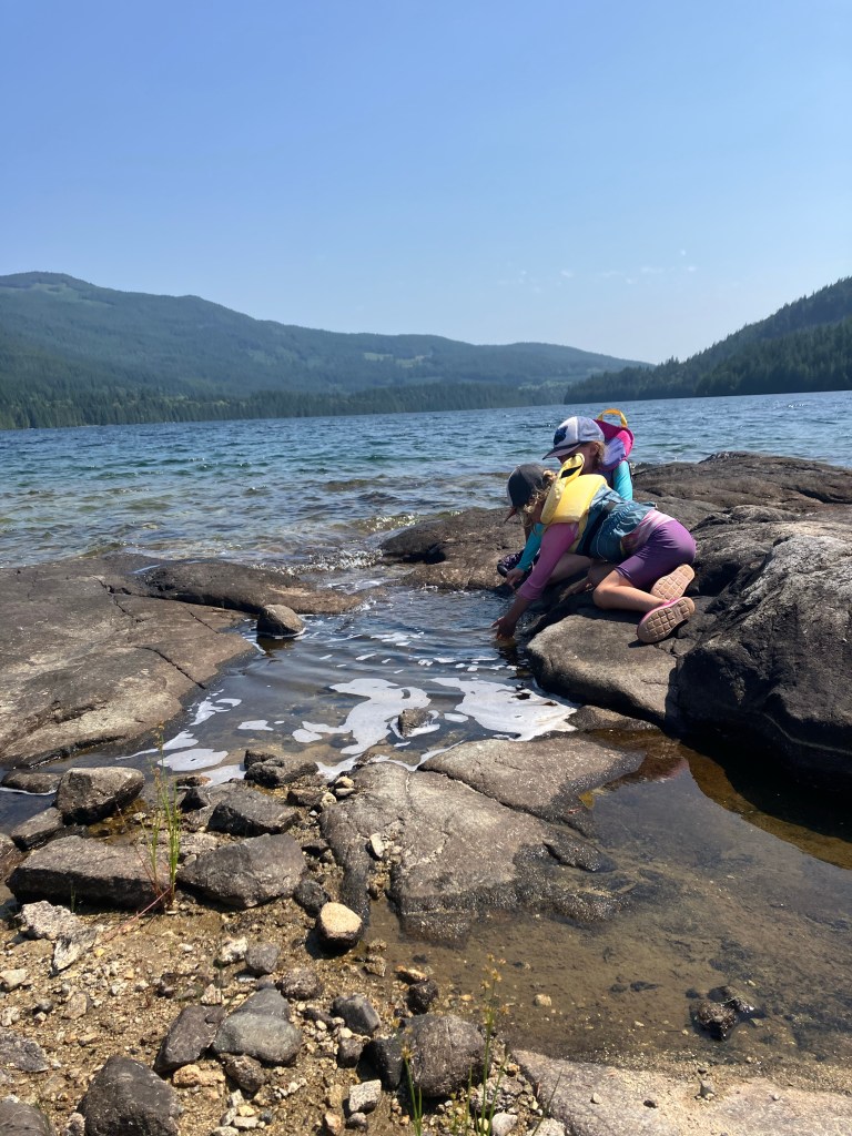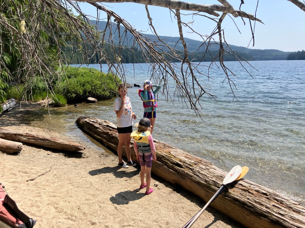 On Thursday we left Willingdon Beach and headed to Inland Lake. We’d camped at the campground there back in 2021 (read about it here!) and spent a lovely day on Anthony Island, which is a small island about 4km from the campground. It’s accessible via bridge and has a couple of campsites on it. Knowing how beautiful it was, we headed that way with the aim of camping on Anthony Island this time. We loaded up our gear, Peter, and both girls in our tandem kayak while I took the paddleboard.