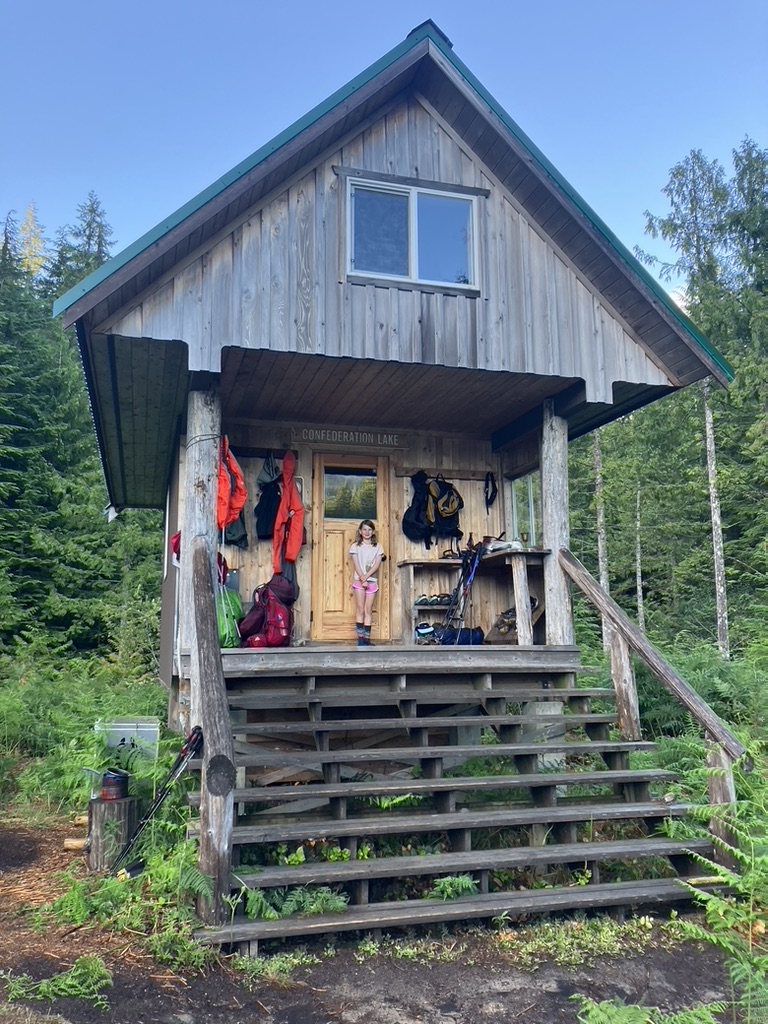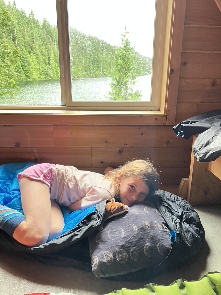 Our journey took us up the East side of Tin Hat Mt., down to Fiddlehead Landing on Powell Lake, up to Confederation lake, and ending where we had parked our car at Inland Lake. We of course missed our ferry which would normally not be a problem, but meant that we had to reschedule an off-road shuttle which would take us to the beginning of the trail and pushed back our start time to 5pm. Which is a little bit late to start a 7km hike up a 1100 meter tall mountain with an 8 year old. But in the end we made it. Pearl had her trusty stuffy Whiskers to share the journey and a backpack full of her water, clothes, and our two camping pillows.