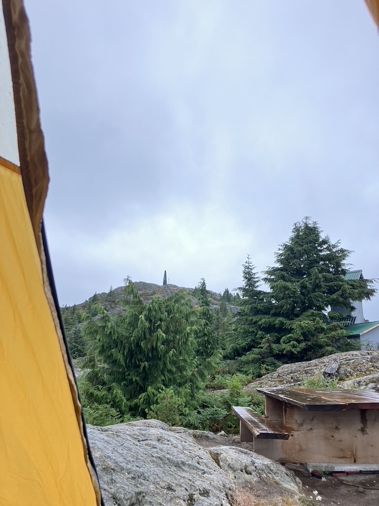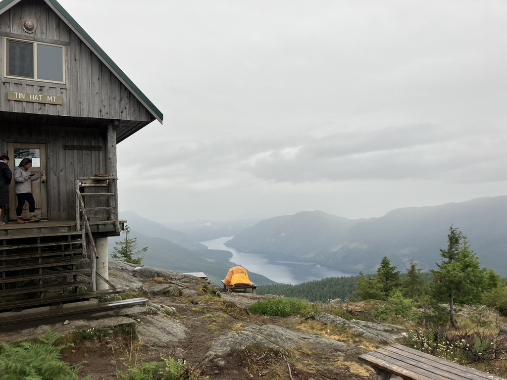 It began to rain as we reached the peak of Tin Hat Mountain. So we quickly set up our tent on a platform overlooking a steep drop off and huddled under the porch of the hut to eat a dinner of sandwiches with a number of other adventurers also seeking shelter from the rain. Spirits were high as we settled into our tent where we had an off-brand chocolate bar for desert.
