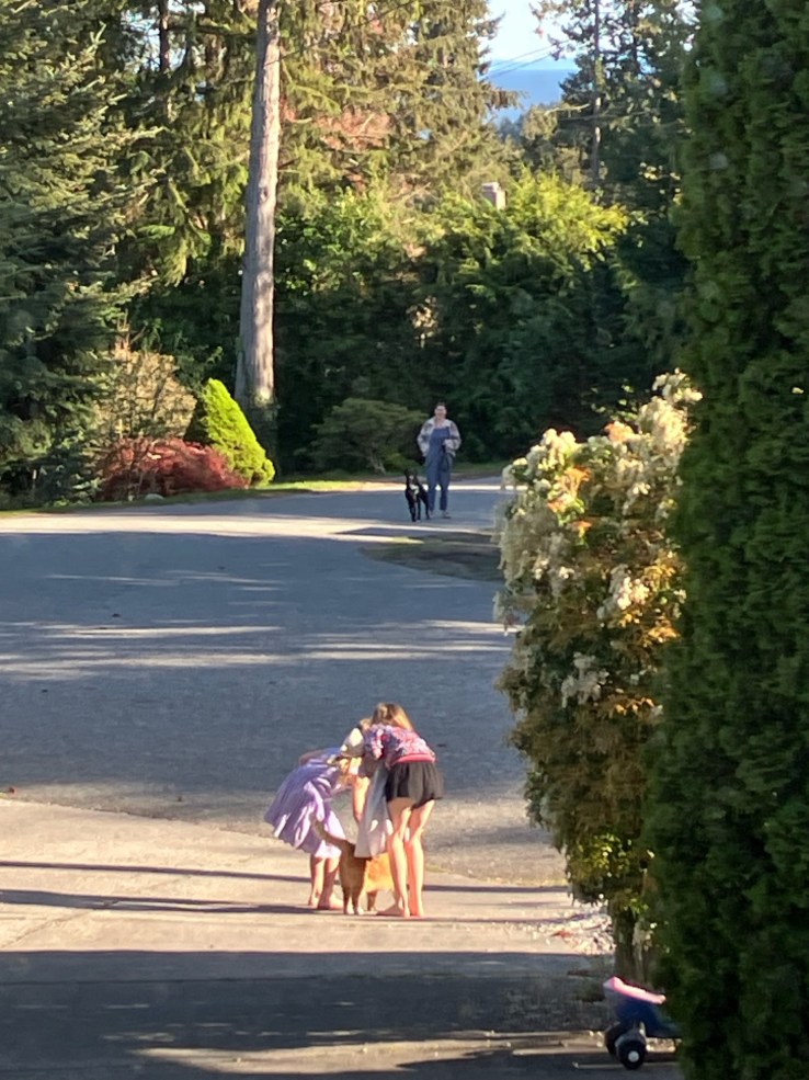 Took Winnie the Dog for a walk and came back to the ultimate betrayal – the kids petting a neighbour’s cat!