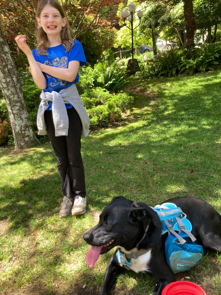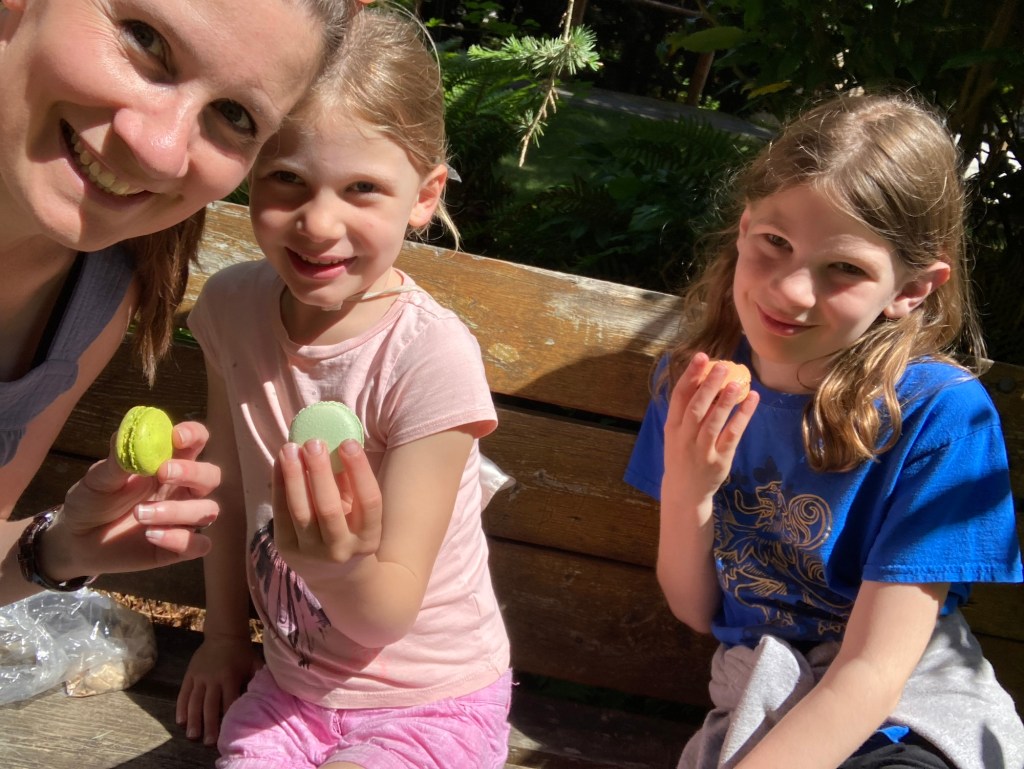 On Saturday we took the dog for a long walk, all the way to the Farmers Market downtown. Pearl and Rose popped into a store on their own to make a purchase while I waited outside with the dog. We strolled through the market and bought macarons and then ate them in a public garden nearby. Pearl lost a tooth! We walked home, stopping at a garage sale on the way.