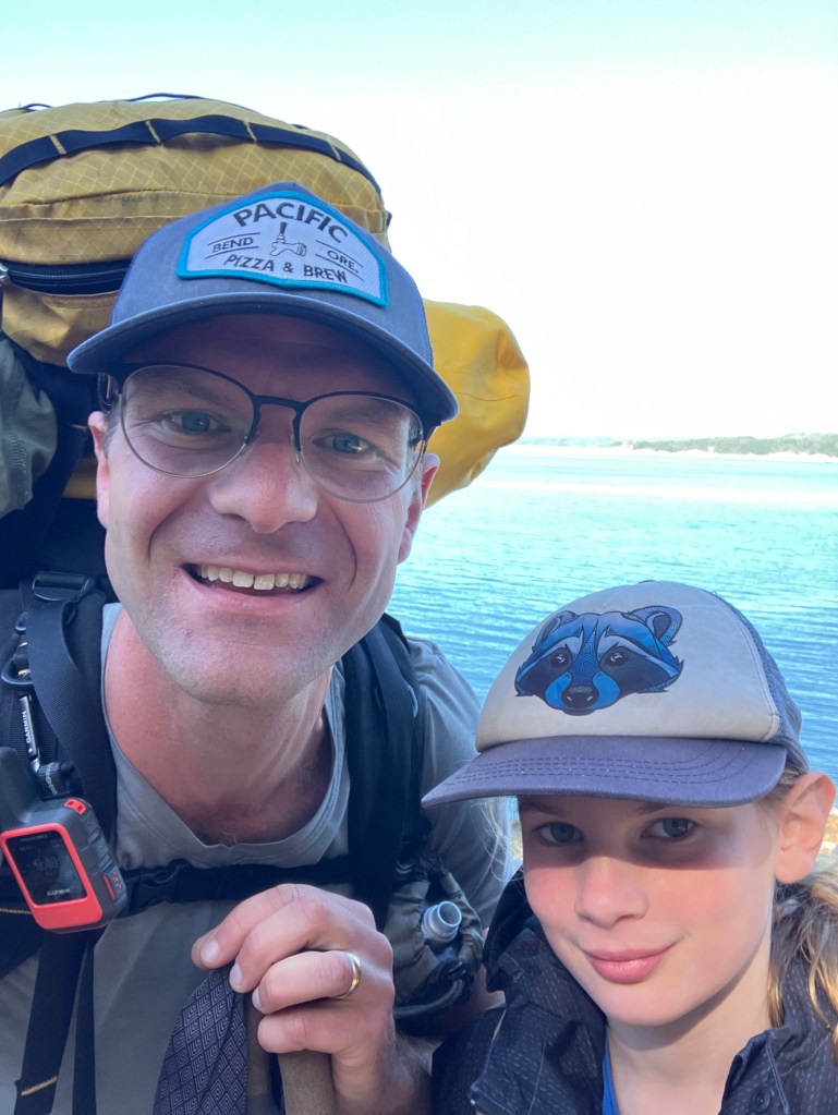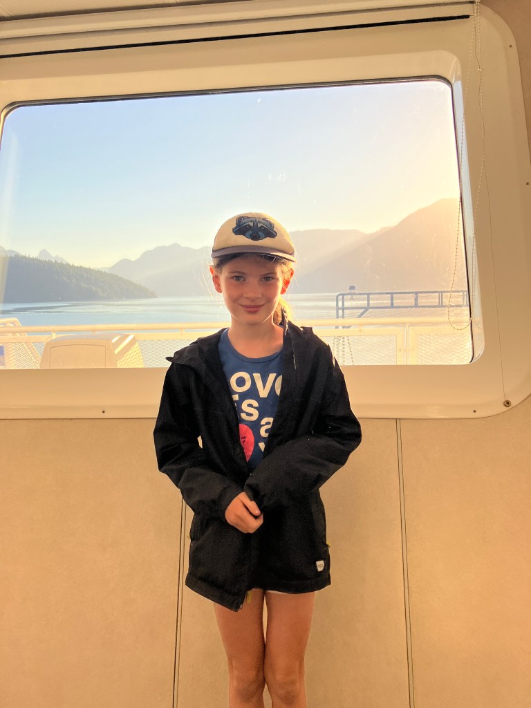 So, on Thursday of last week I scooped nine-year-old Pearl out of bed at 5:00AM and drove to the ferry at Earl’s Cove. There, we changed out of our pajamas and finished eating our toasted bagels. Once the ferry landed we booted our way up the peninsula and parked at the Shingle Mil where there was a helpful lady who told us where to park for free. I wasn’t sure how long the hike was going to take, so I was ready to pay for parking and had supplies for 4 or 5 days on the trail (my pack started the trip weighing 58lbs). From there a local offroad shuttle picked us up, along with two other hikers and a dog, and drove us the remainder of the way to the trailhead. Half on pavement, half off.