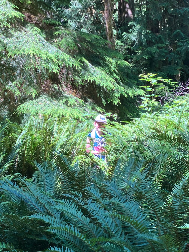 We stopped every hour for a snack break (trail mix, gummies, chocolate bars, and jerky) and constantly sipped on water as the temperatures were between 26-29 degrees celsius (which is hot for this part of the world). In some places the forest has grown over the trail and Pearl found herself tangling with ferns that towered over her head. About 12 km into the trail we stopped for a swim at Wednesday Lake.