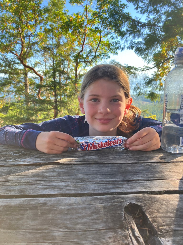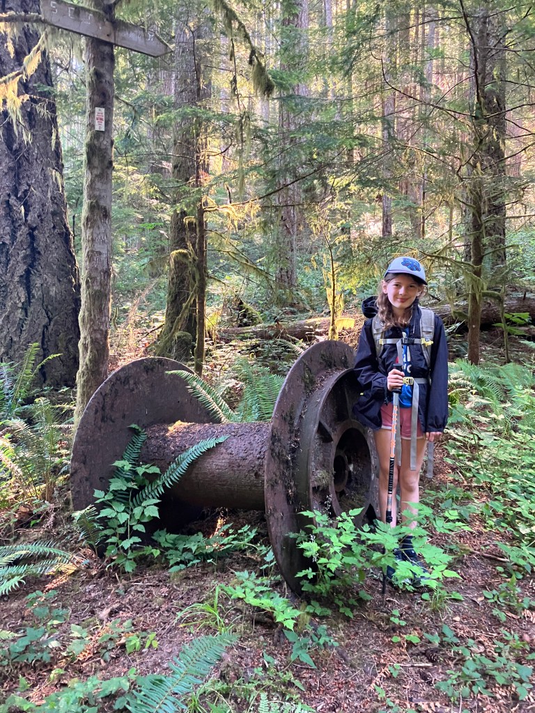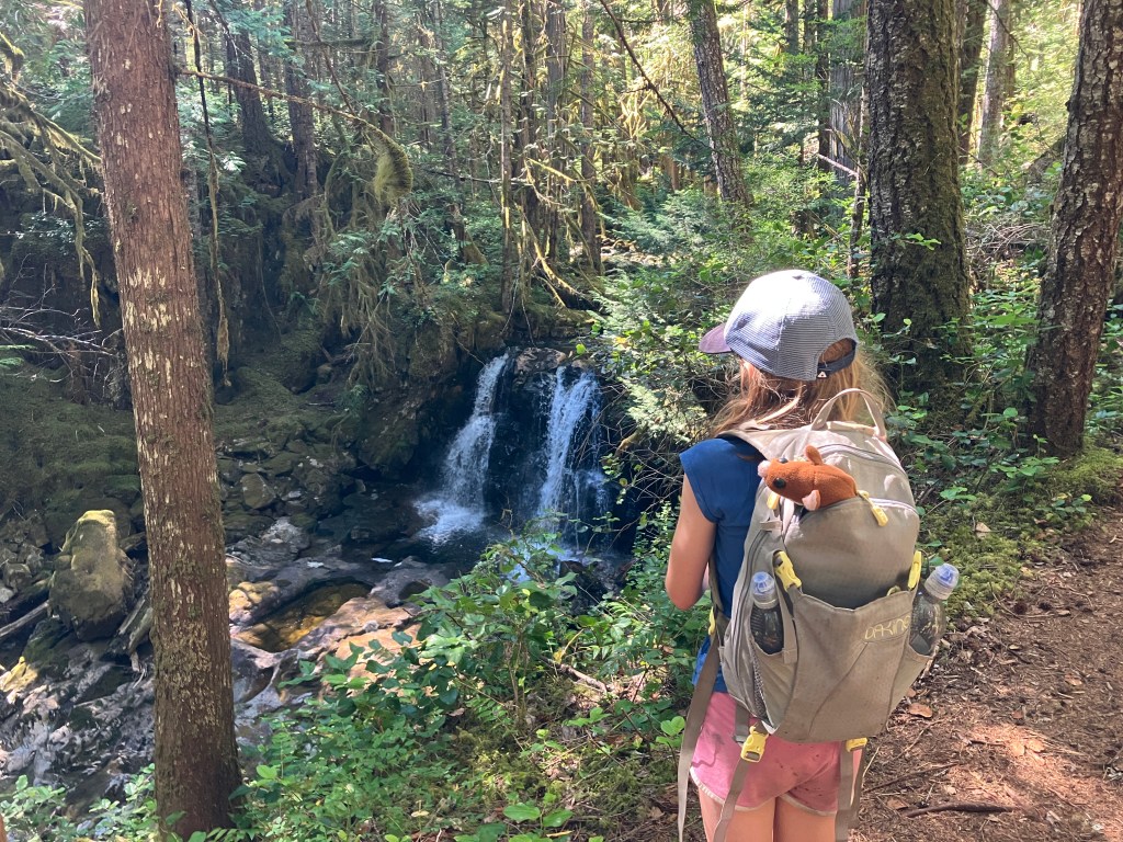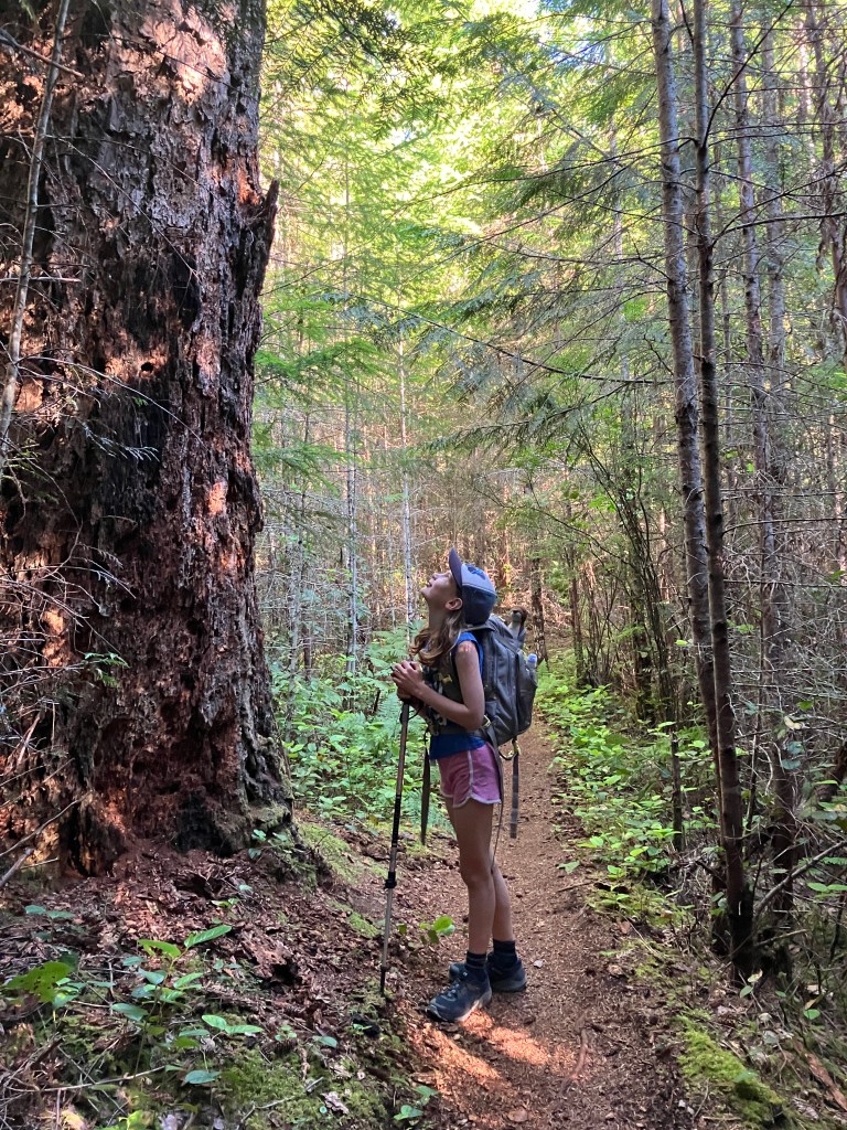 I woke her up at 6AM with a cup of hot chocolate and we hit the trail before 7. This day we ended up covering 24km by the book, but closer to 30km on my GPS. We debated the best flavour of sour patch kid, pointed out where her stuffed weasels would live if this was their forest (you’ll see one poking out of her pack in some photos), played games like “guess the movie in 3 clues”, and “can’t say yes, no, black, or white”. When we got really tired we counted trail markers (anywhere from 28-54 markers between each kilometer). We passed many giant Douglas Firs scarred by wildfires from over 100 years ago, crossed many bridges, and followed the course of several winding creeks loaded with waterfalls.