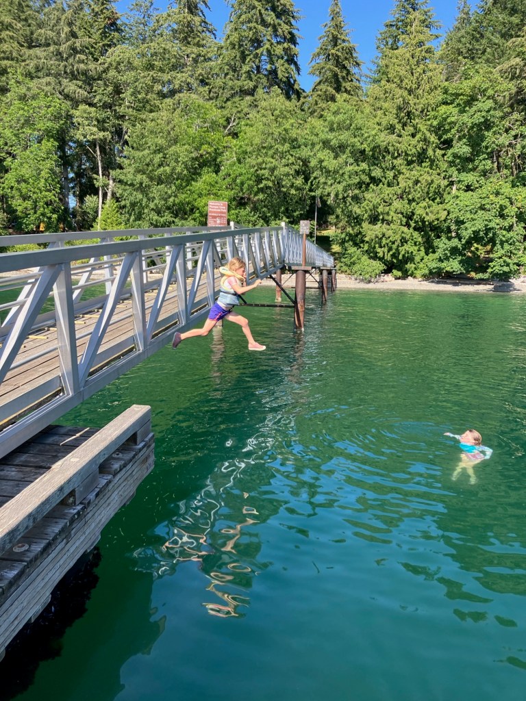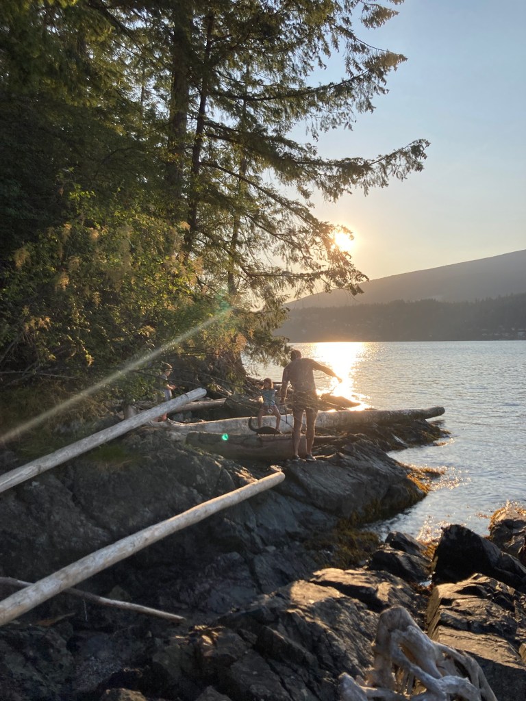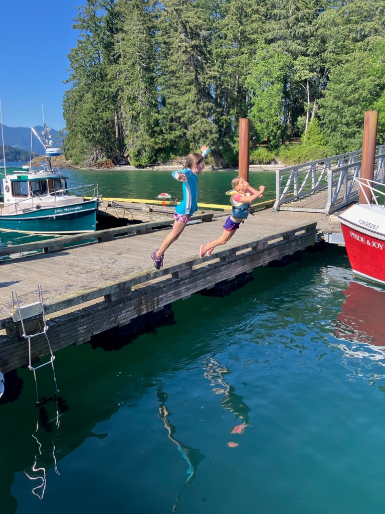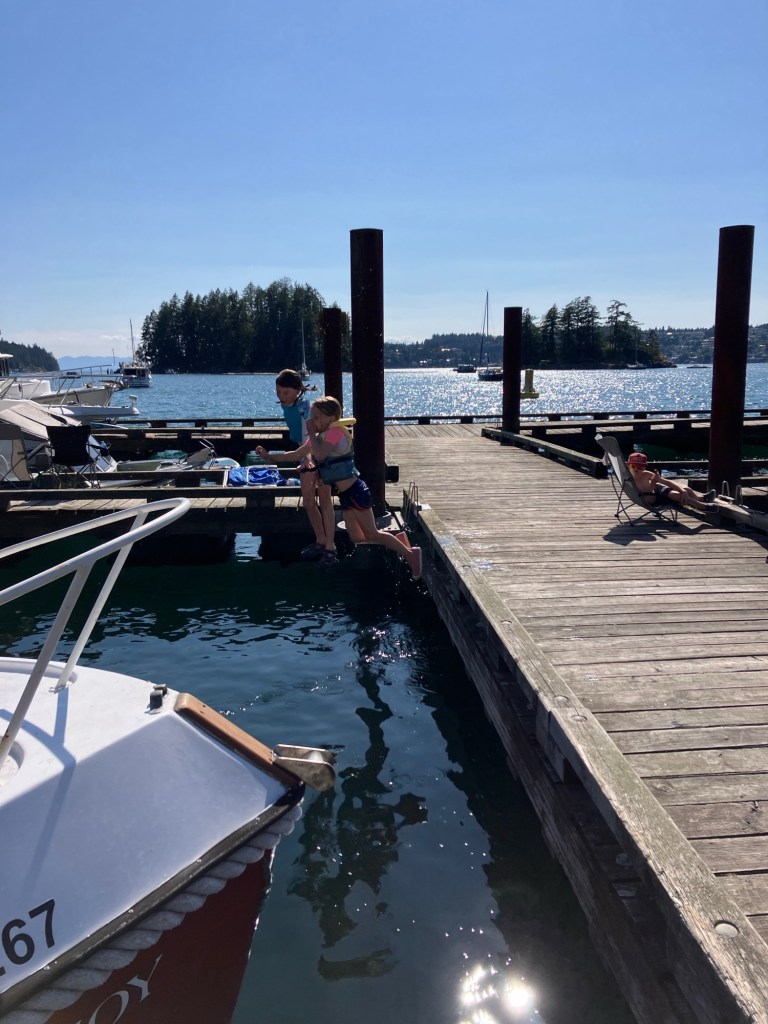 On Friday, some good friends joined us for the day. They came over by ferry and hiked from Keats Landing to Plumpers while we met them partway. The day together flew by as we swam, snacked, and played. They also have two kids, a little younger than ours. In the afternoon, we all hiked together to Camp Barnabas for ice cream at the General Store there.