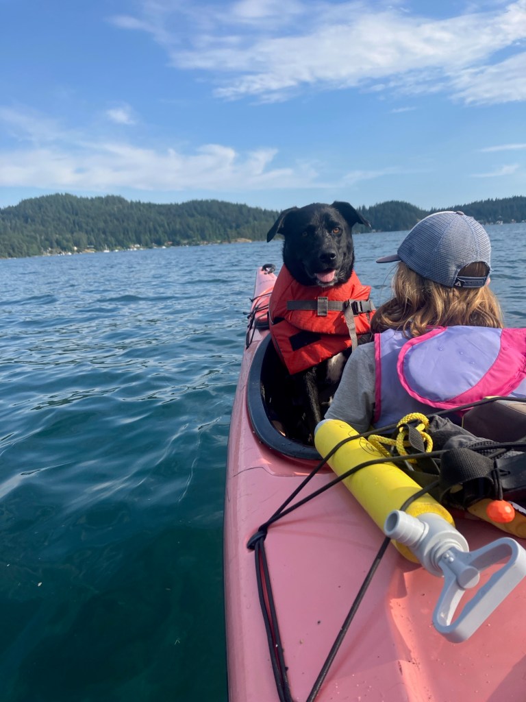 Our kayaking configuration was similar to last year – Peter steering the tandem kayak, Pearl in the front seat with Winnie the Dog, and Rose seated in a rear hatch while I went in the single kayak.