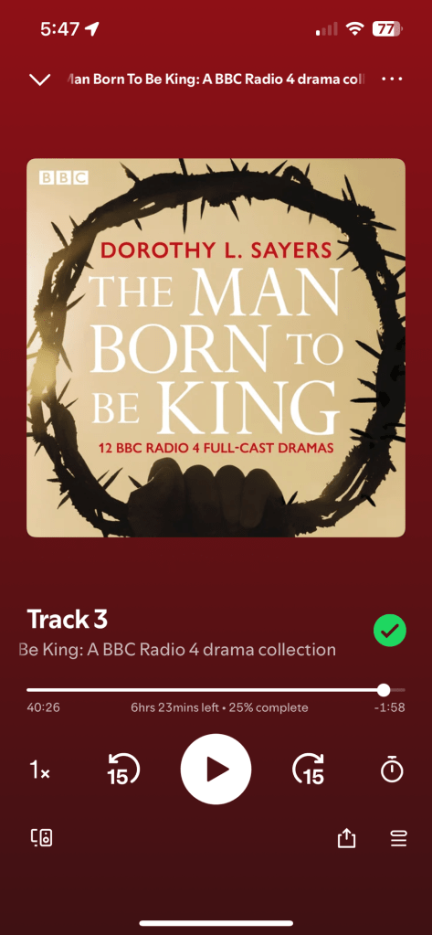 When I added this to my TBR back in 2019, I don’t think I realized that it was written as a play and not a book. Not until I saw it available on Spotify and looked into it a little further did I realize this was how it was meant to be experienced. The Man Born to be King was produced as a full-cast radio play by the BBC during World War II. It is divided into 12 plays, or cycles, depicting the life of Jesus Christ from birth to resurrection. It has a full cast with all of the characters voiced by actors and includes some background noises and music to add to the scene setting.