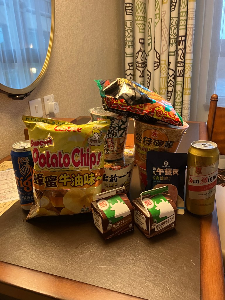 So we got on the train without much food. There is one 7-11 on the Disneyland property, about a 20 minute walk from our hotel and so on our first afternoon, Peter went there and got us some food but found that options were limited. For dinner that night, we had a selection of ramen, cooked with the hot water provided in our room.