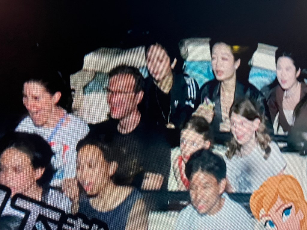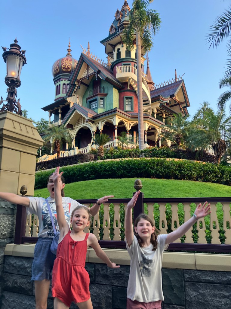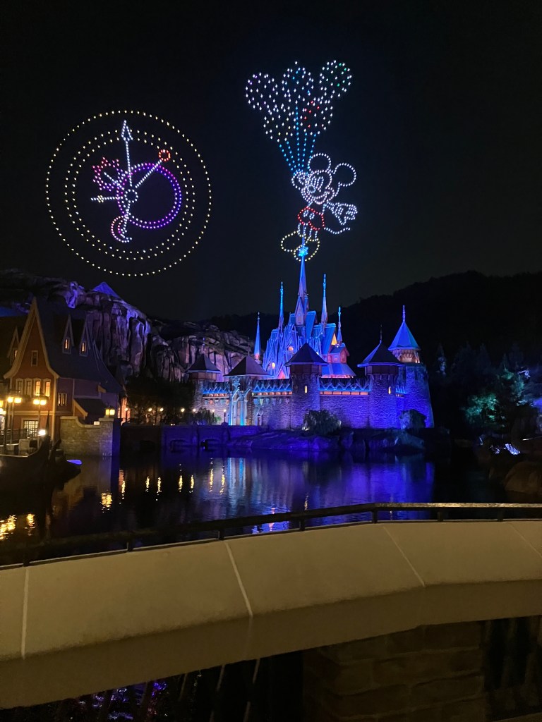 By the end of the first day, we had been on most of the rides and through every section of the park. We joined the crowds near Cinderella’s castle for the evening show. Peter and I both recalled the Electric Parade and the fireworks at Disney as children but weren’t entirely sure what to expect here. But we joined the throngs and patiently waited. In the end, the show is a series of movie clips projected, along with music, against the backdrop of the castle. There are also water features, fireworks, and drones. It was fun and impressively done but also probably longer than I would have chosen. We were glad we watched it, but we also all agreed that on our second night we would take advantage of everybody else watching the show and go ride our favourite roller coasters instead.